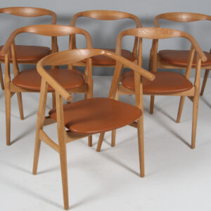 Hans J. Wegner sæt på seks armstole af eg og Walnut Elegance læder. Model GE525