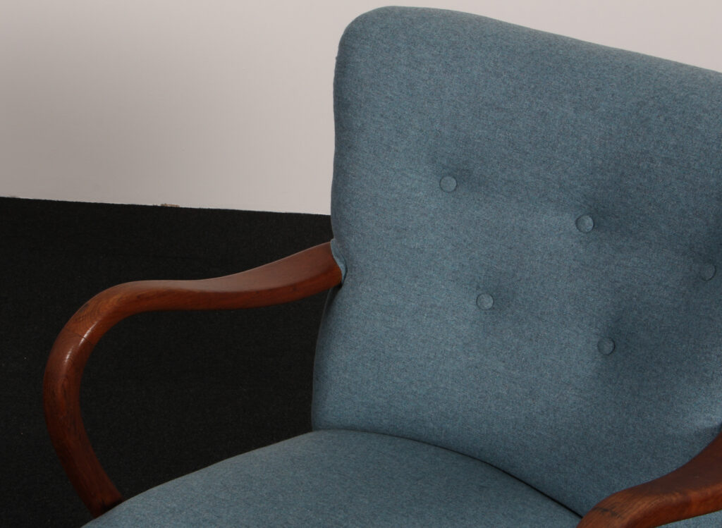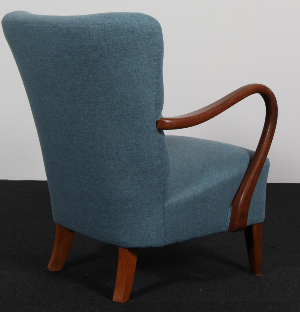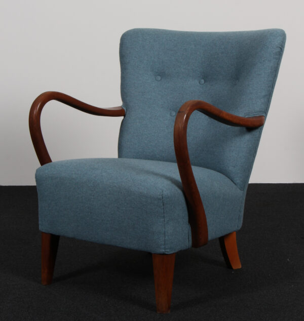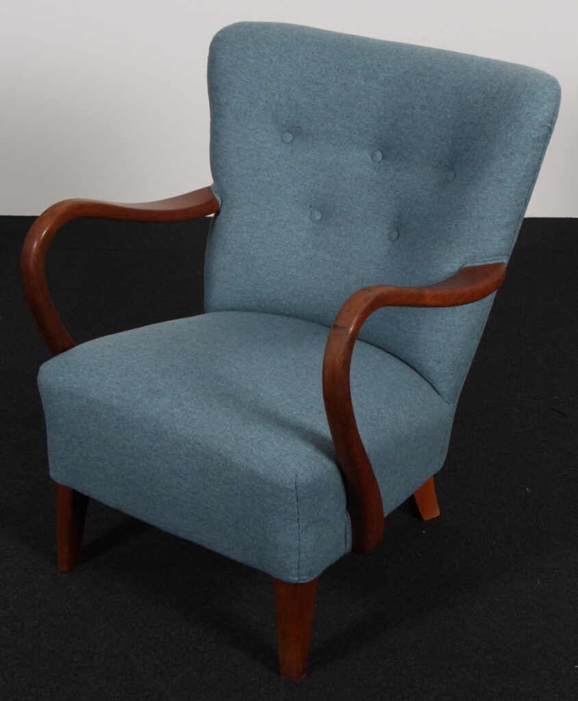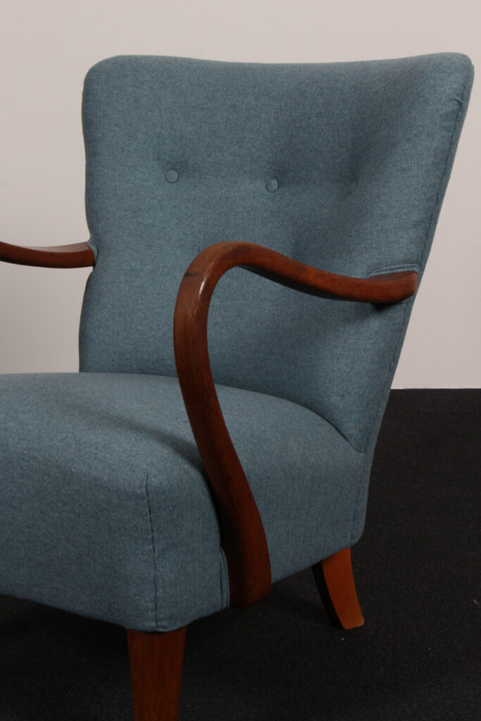 Alfred Christensen lænestol med stel af bejdset eg. Nybetrukket med blåt uldstof. Fremstillet hos Slagelse Møbelværk. H. 83/41 B. 61 D. 80 cm. Nyrenoveret