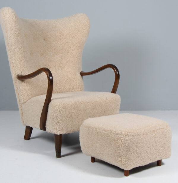 Alfred Christensen lænestol samt skammel nybetrukket med lammeuld. Ben samt armlæn af bejdset bøg, forben med messing sko. Fremstillet hos Slagelse Møbelværk. H. 108/42 B. 70 D. 90 cm.