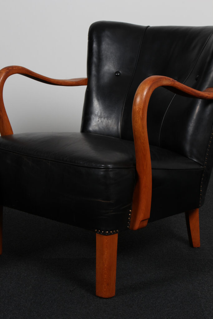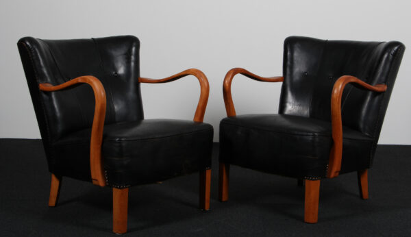 Alfred Christensen par lænestole med stel af bøg. Betrukket med sort patineret læder, delvist sømbeslået. Fremstillet i 1950’erne. H. 77/42 B. 70 D. 80 cm. Fremstår med aldersrelaterede brugsspor.