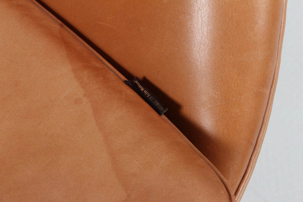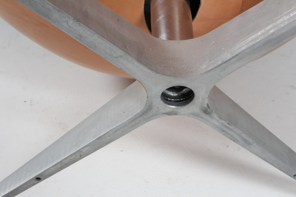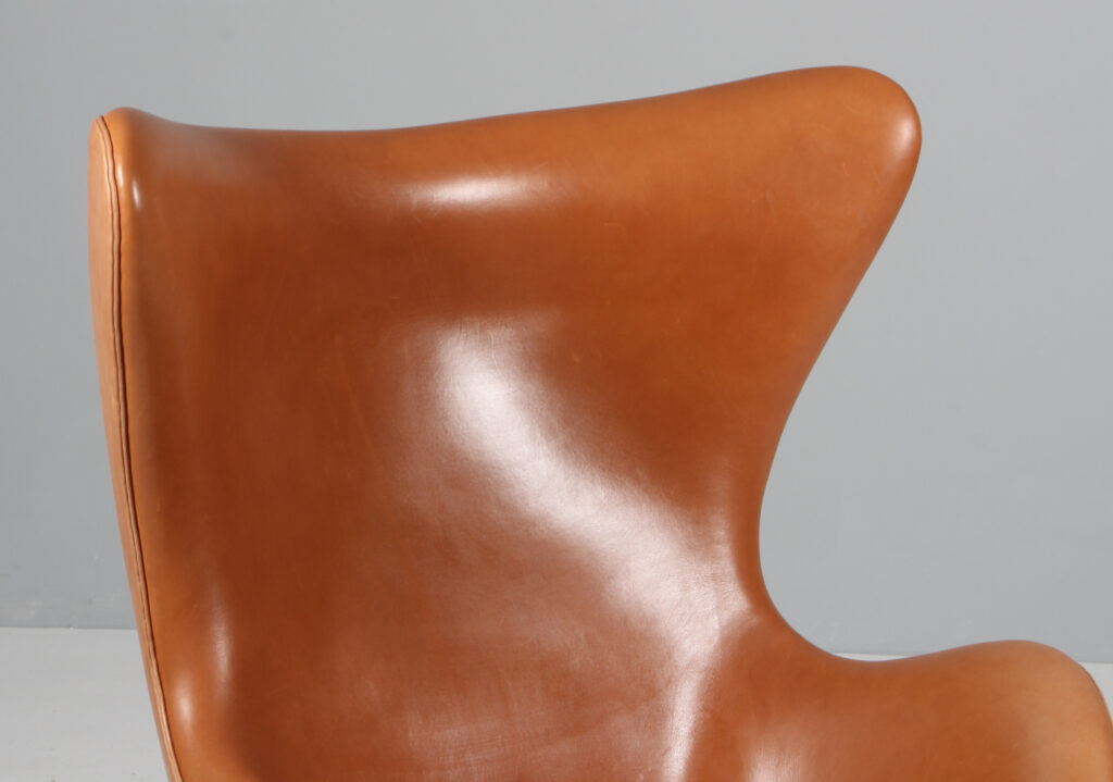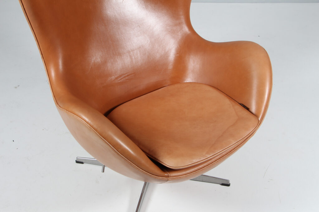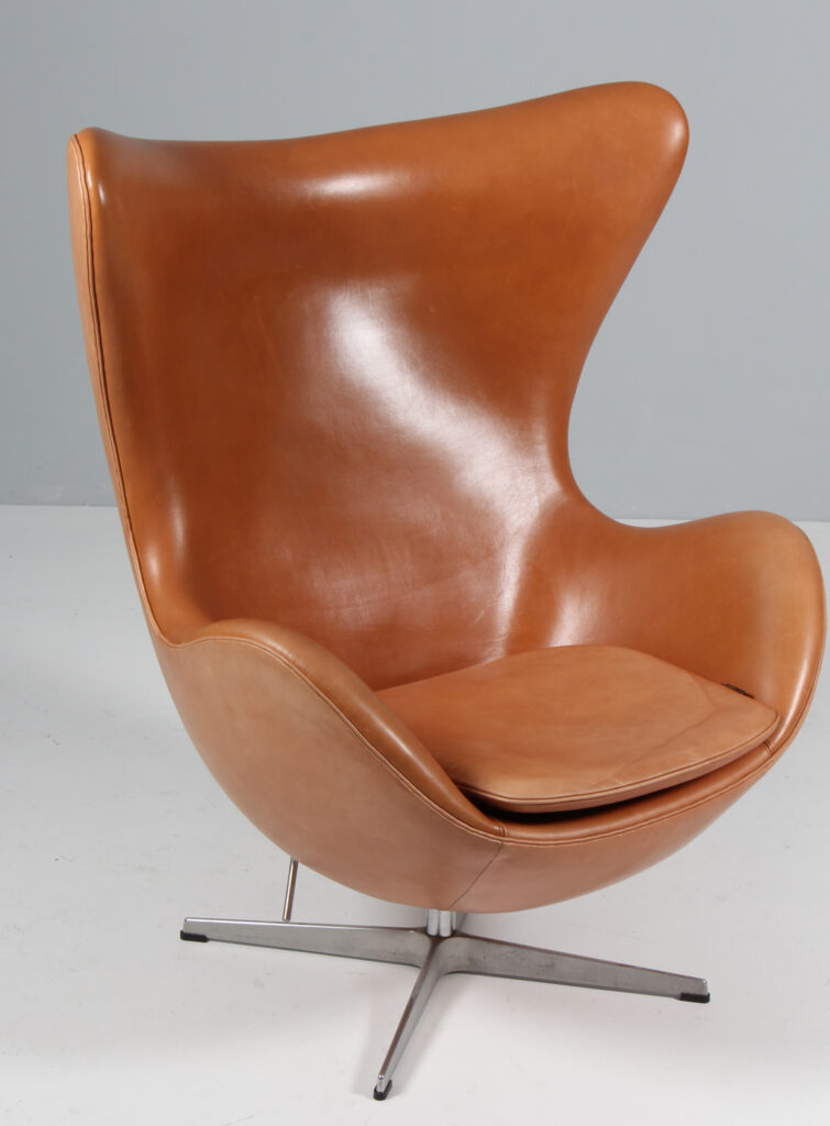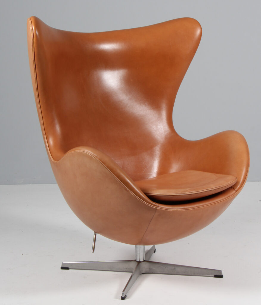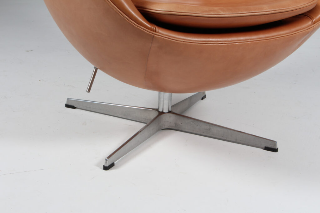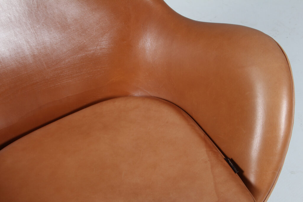 Arne Jacobsen 1902 – 1971. ‘Ægget’. Lænestol , original polstret med ‘walnut Grace anilin læder, drejelig midtersøjle med firpasfod af aluminium Med vip samt retudrej. Formgivet i 1958-59 som en del af totalindretningen i Hotel Royal København. Fremstillet hos Fritz Hansen model 3316, Brown Label. Fremstår original betrukket med patineret læder