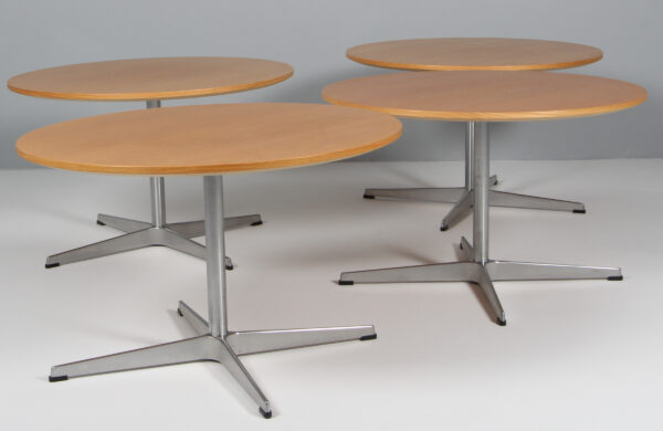 Arne Jacobsen og Piet Hein. Sofabord med cirkulær plade af eg, firpasfod af profileret aluminium. Fremstillet hos Fritz Hansen. H. 47 cm. Ø 75 cm.