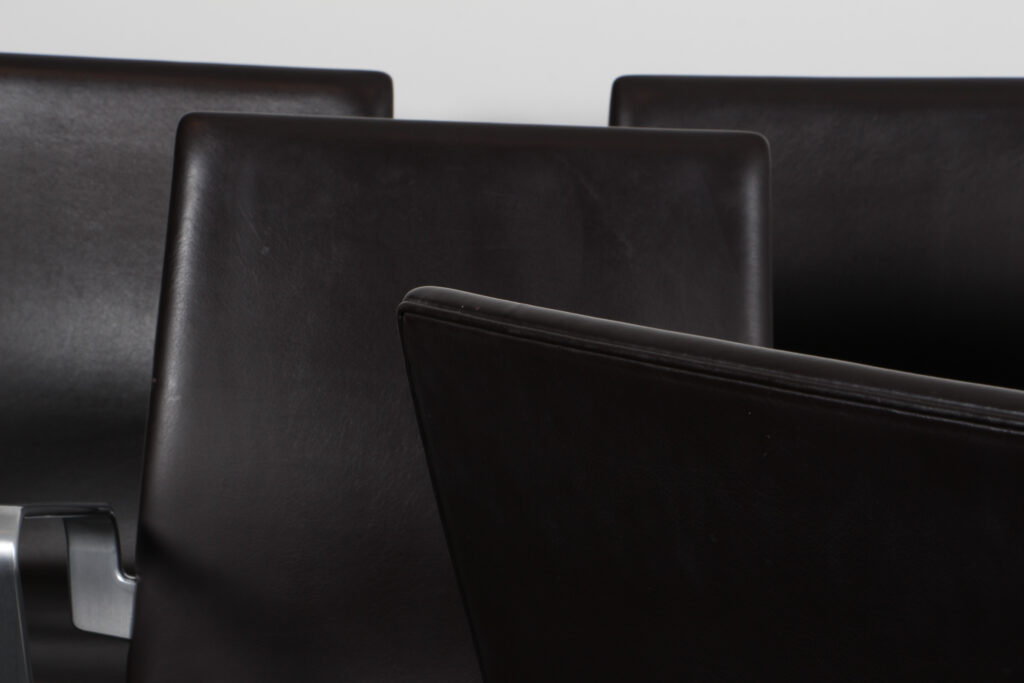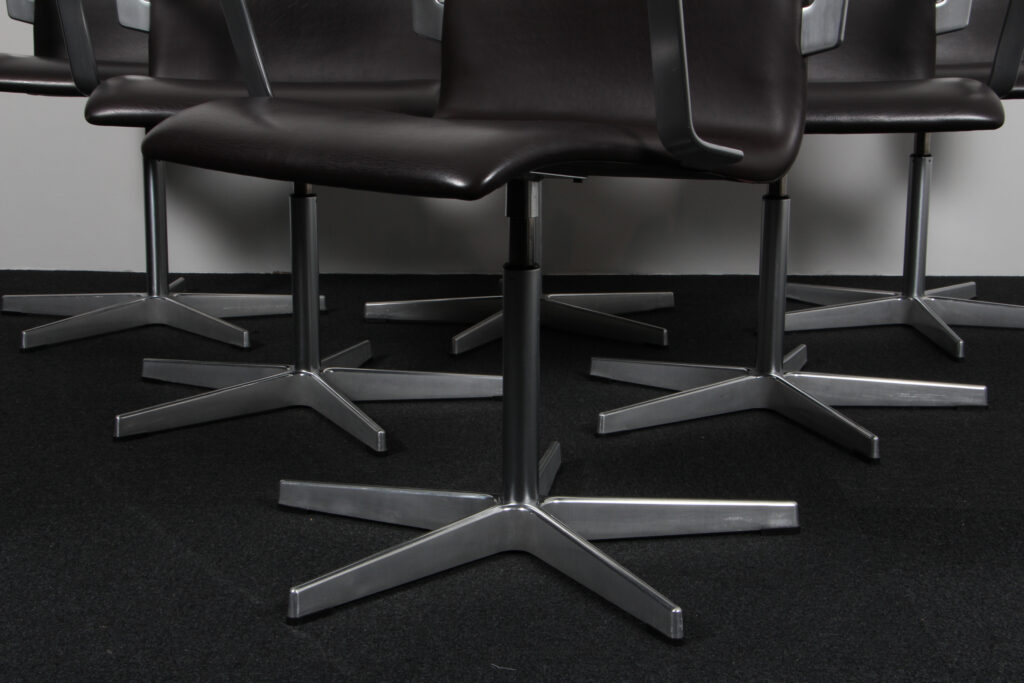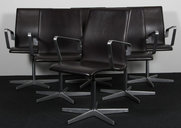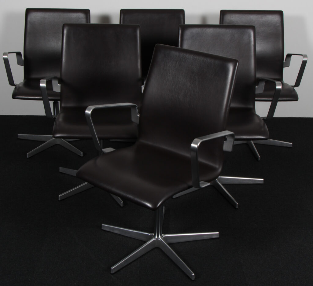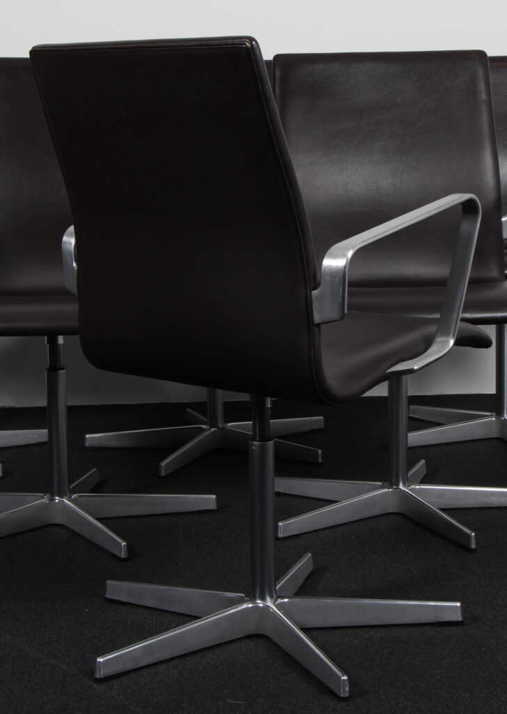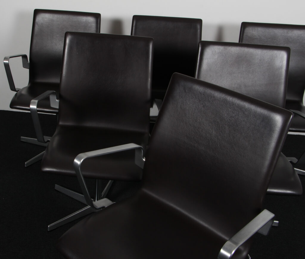 Arne Jacobsen Oxford armstol, original betrukket med mørke brunt læder. Stel af børstet stål. Model Oxford, fremstillet hos Fritz Hansen, Brown label. H. 93/49 B. 60 D. 60 cm. Pris pr stk, flere haves