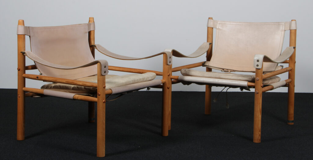Arne Norell par safaristole med stel af ask. Betrukket med patineret lyst læder. Model Scirocco, fremstillet hos Norell Møbler. H. 72/40 B. 71 D. 65 cm.