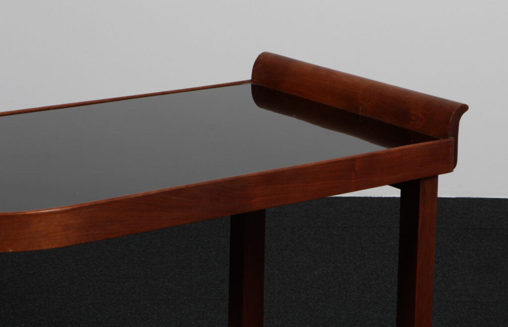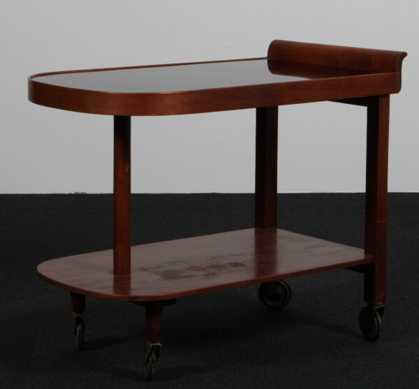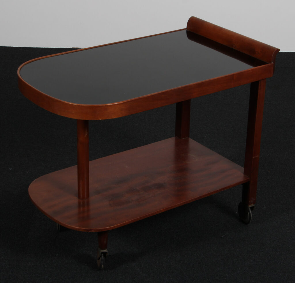 Art Deco serveringsvogn med stel af mahogni. Plade af sort glas. Fremstillet i 1940’erne. H. 61 B. 43 L. 73 cm. Fremstår med aldersrelaterede brugsspor.