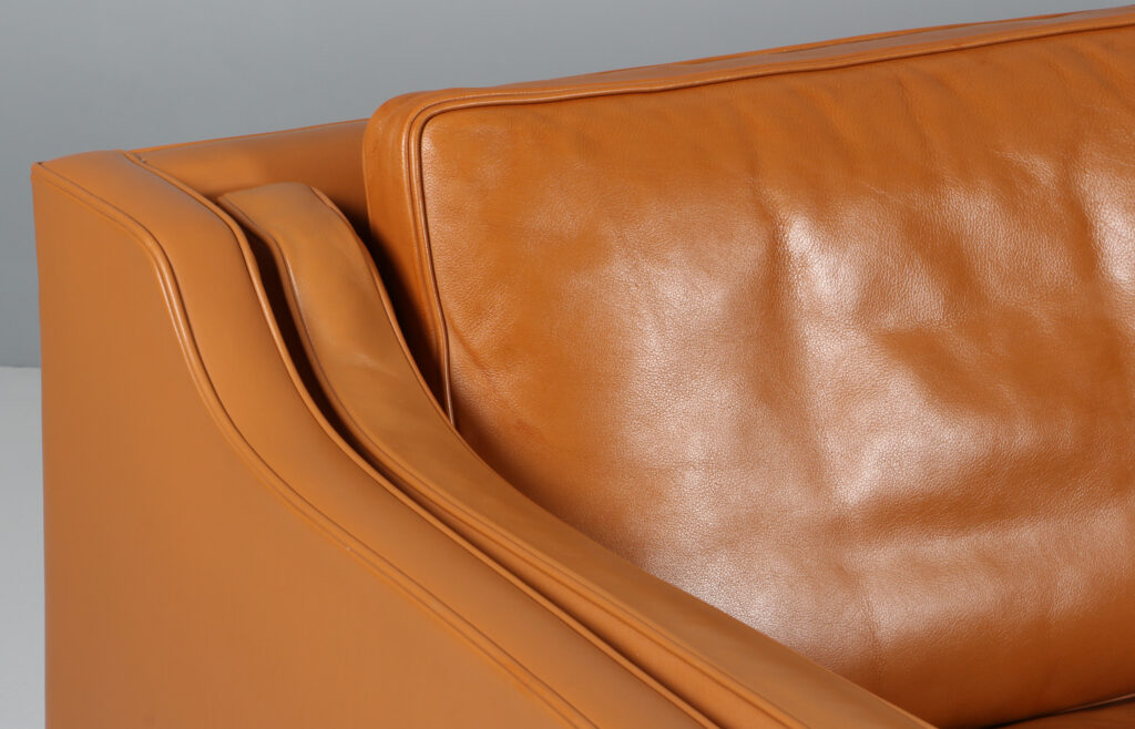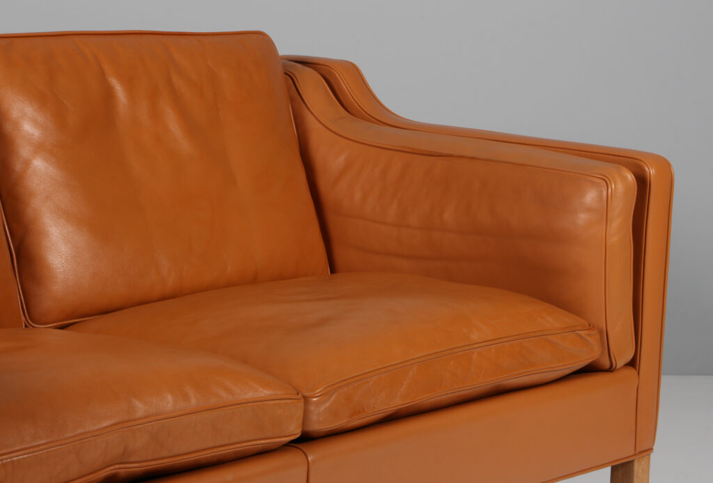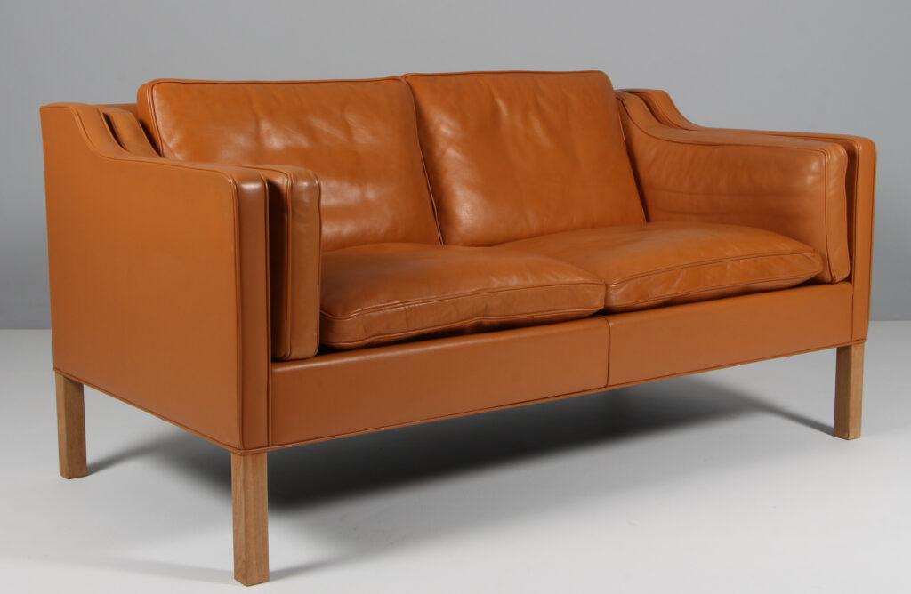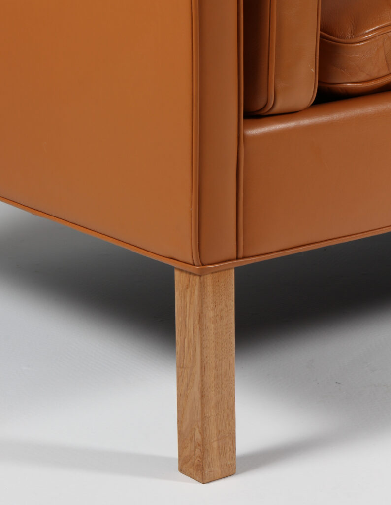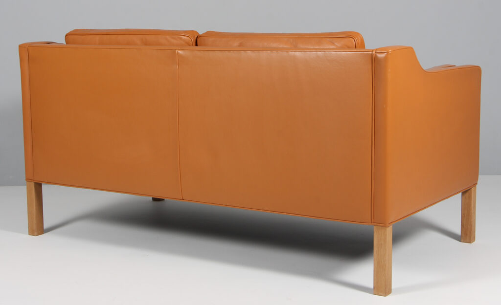 Børge Mogensen 1914-1972. Fritstående to-pers. sofa, original betrukket med cognac farvet læder, løse dun polyhynder i sider, sæde og ryg, ben af eg. Fremstillet hos Fredericia Stolefabrik, model 2212. Formgivet 1963. H. 76/44. L. 160, D. 90 cm. Matchende 3’er haves