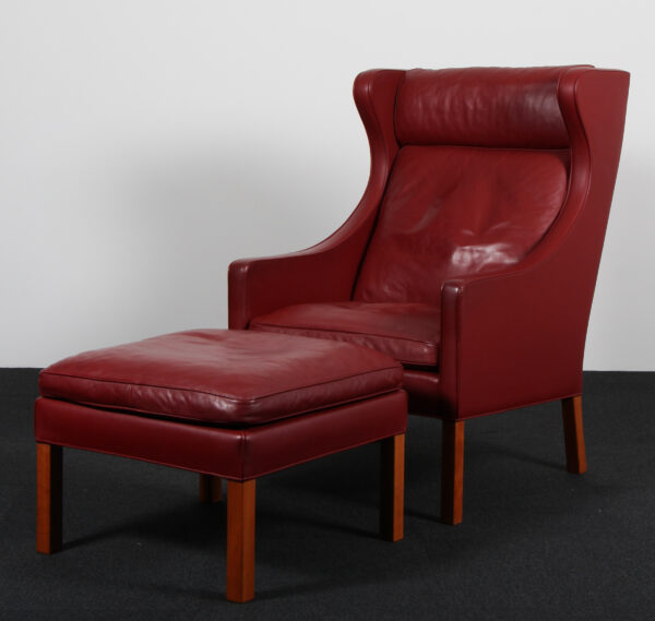Børge Mogensen 1914-1972. Øreklapstol med tilhørende skammel, ben af kirsebær, løse hynder med dunfyld betrukket med rødt læder, H. 107 cm, B. 70 cm, sædehøjde 45 cm. Formgivet 1964, fremstillet hos Fredericia Stolefabrik 2008, model 2204/2202. Fremstår med minimale brugsspor.