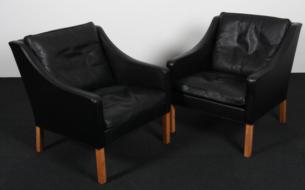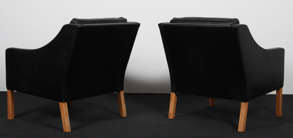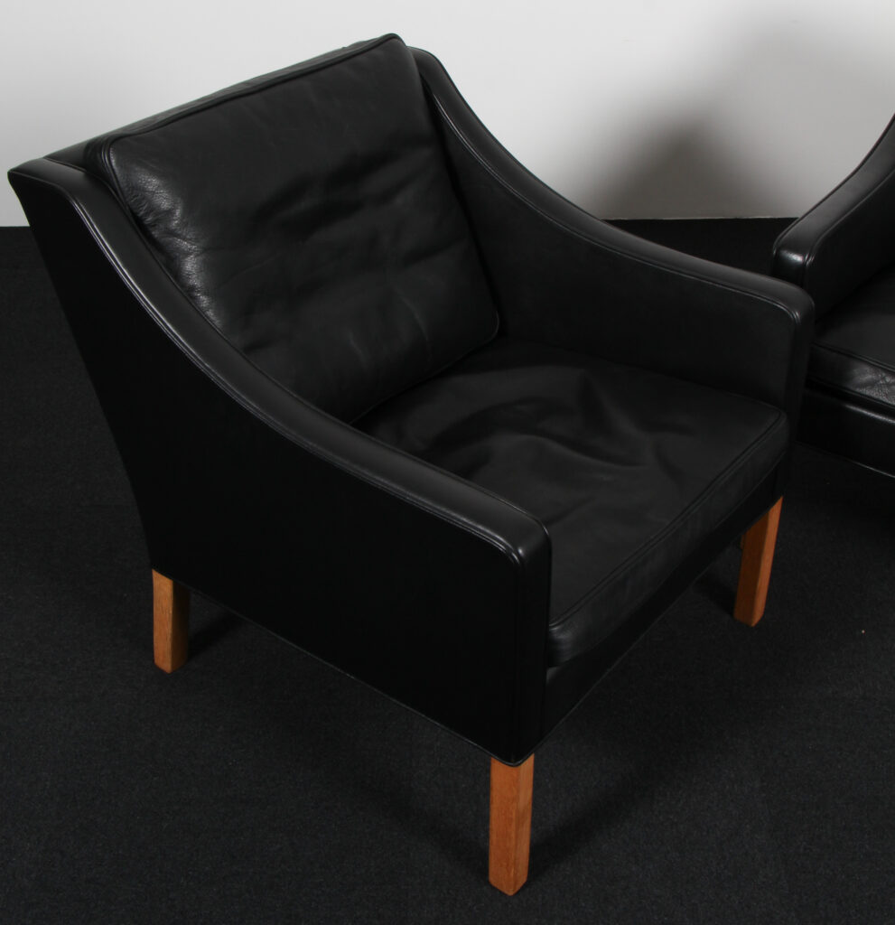 Børge Mogensen 1914-1972. Par lænestole, model 2207, med ben af eg, løse hynder med dunfyld. Original betrukket med sort læder. H. 80 B. 70 sædehøjde 42 cm. Fremstillet hos Fredericia Stolefabrik, formgivet 1972.