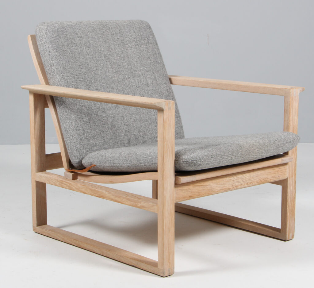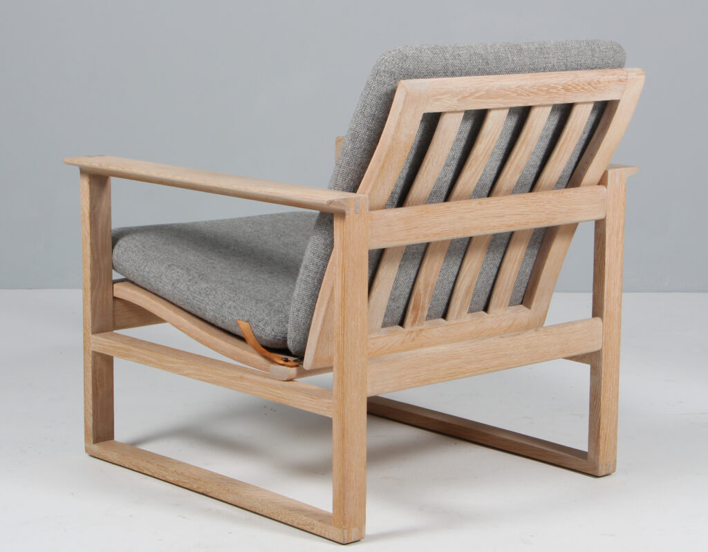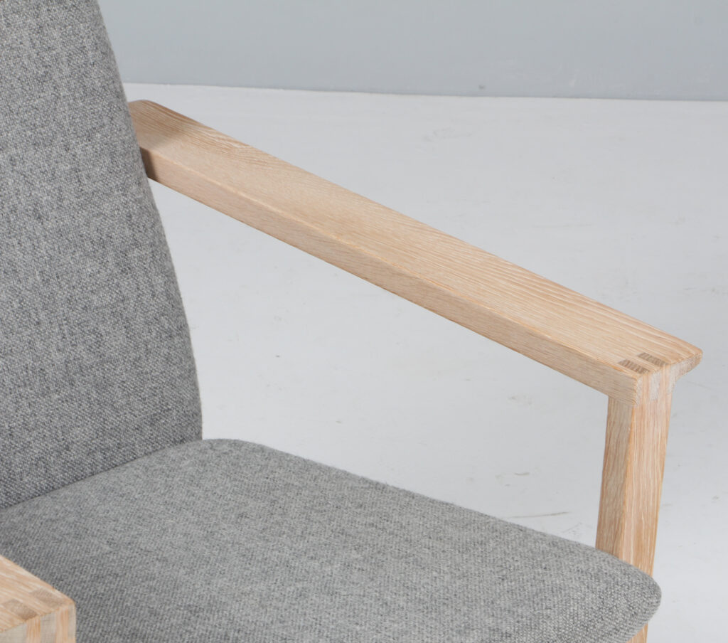Børge Mogensen slædestol med stel af hvidolieret eg. Betrukket med Hallingdal 130 fra Kvadrat. Model 2256, fremstillet hos Fredericia Furniture. H. 70/36 B. 66 D. 73 cm.