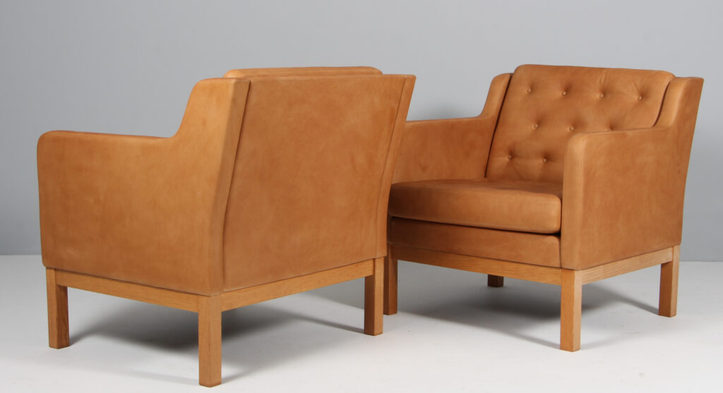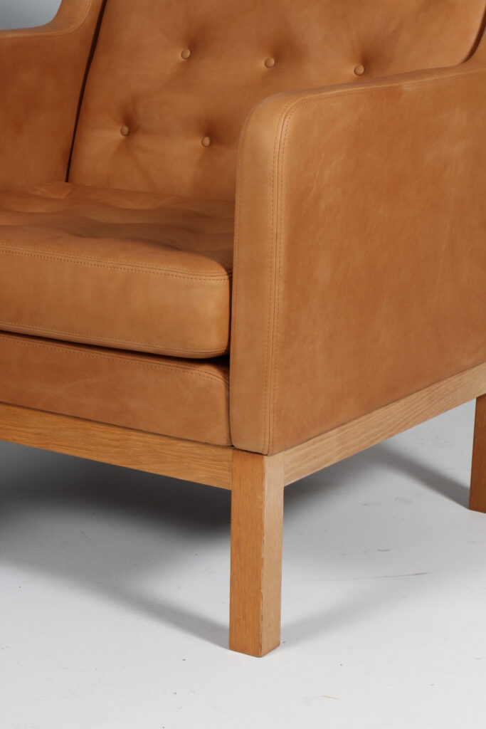 Erik Jørgensen lænestol med stel af egetræ. Nybetrukket med cognac farvet vintage anilin læder. Model EJ315/1, fremstillet hos Erik Jørgensen. H. 78/45 B. 72 D. 78 cm. Fremstår nyrenoveret. Pris pr stk