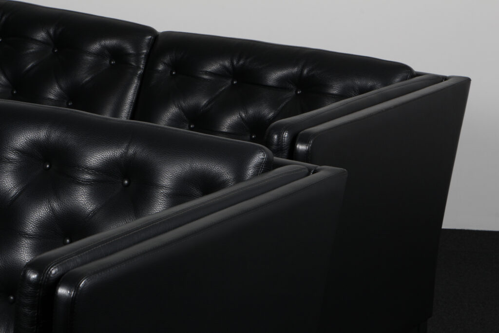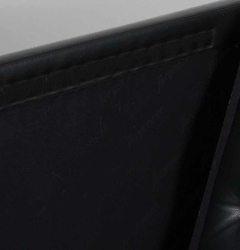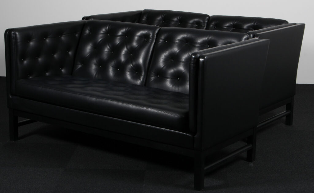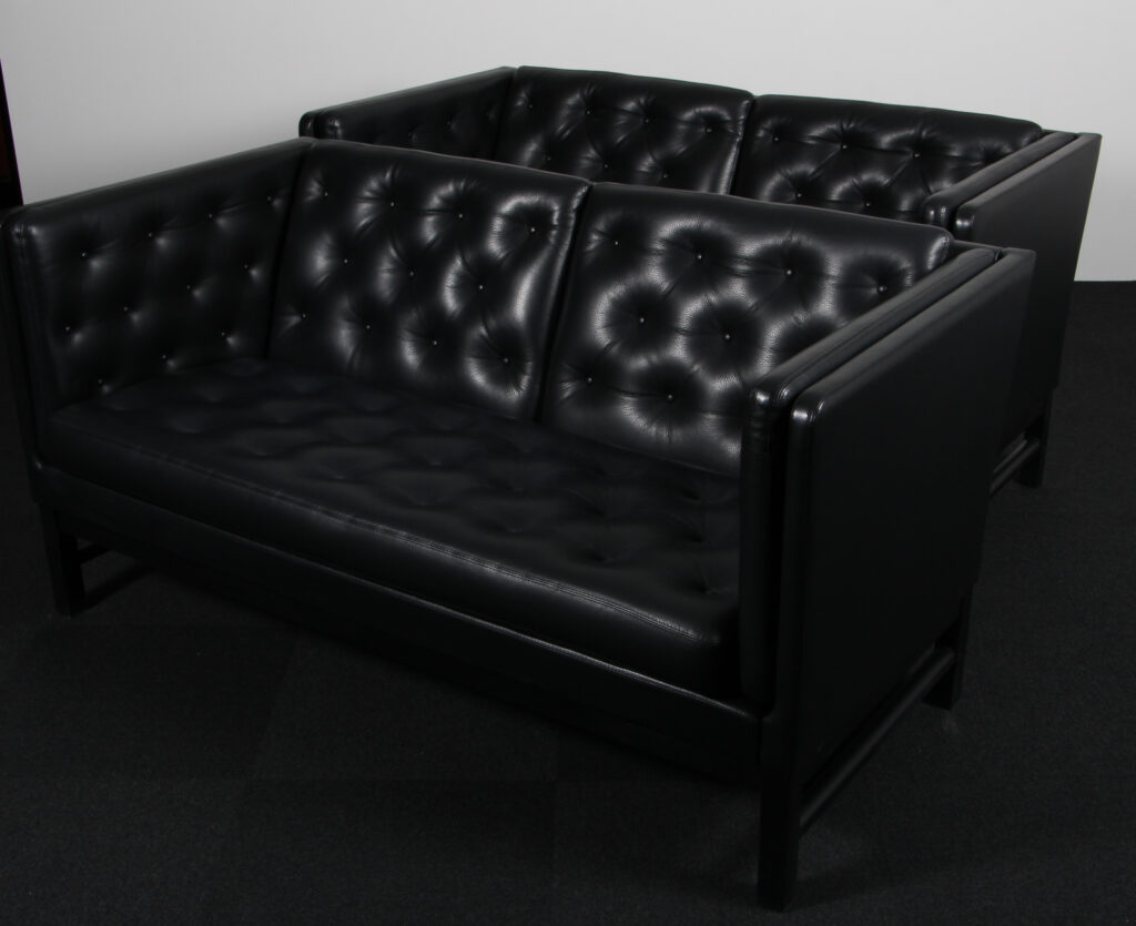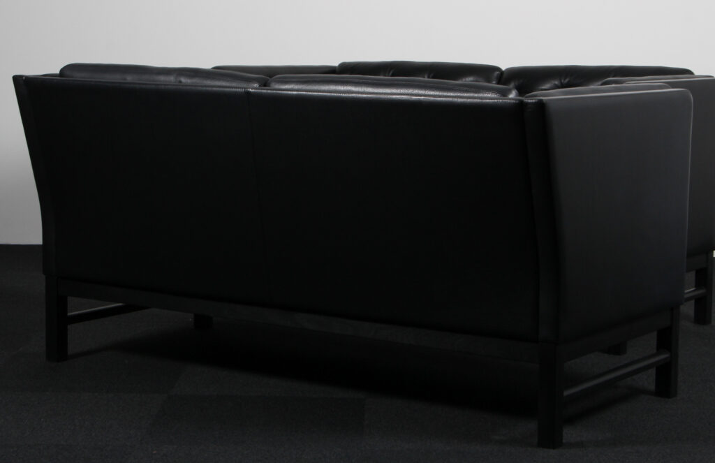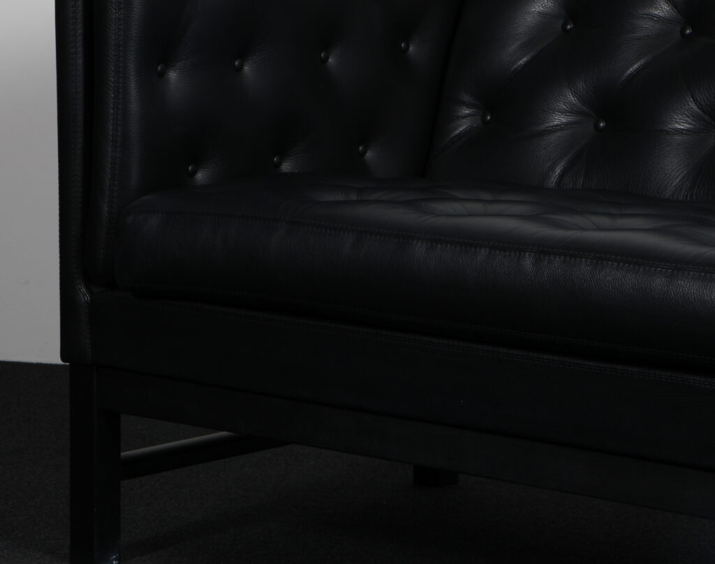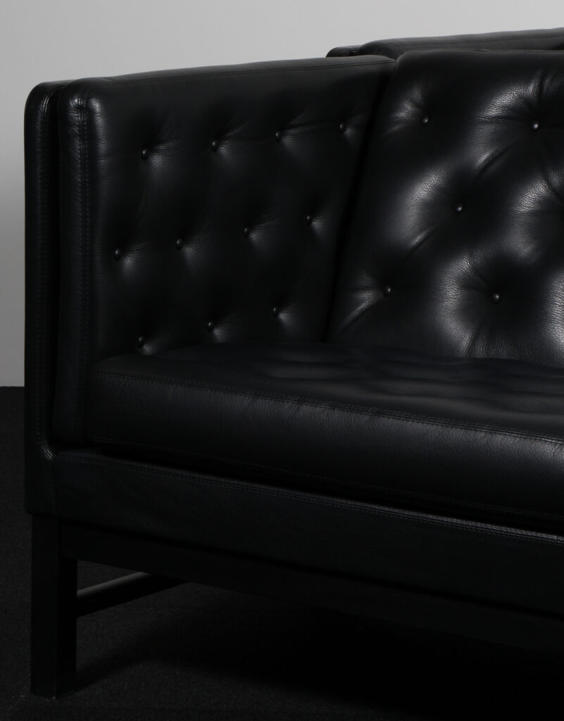 Erik Jørgensen to personers sofa original betrukket med sort patineret læder. Stel af sortlakeret træ. Model EJ315, fremstillet hos Erik Jørgensen. H. 76/43 B. 155 D. 77 cm. Pris pr stk.