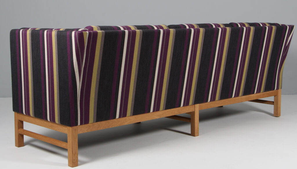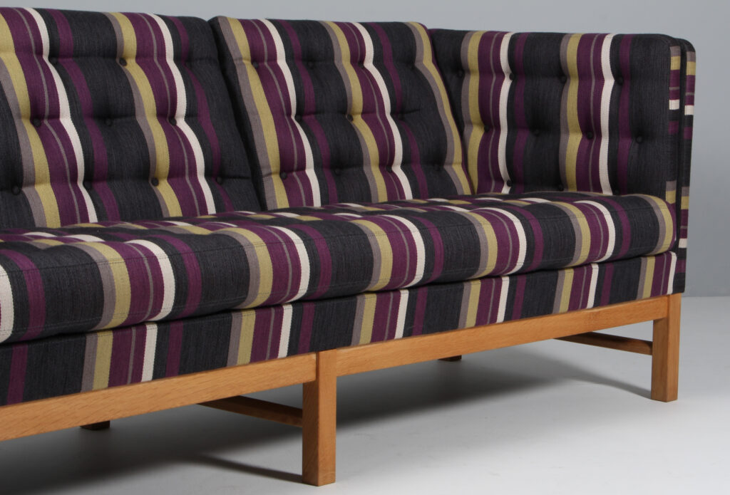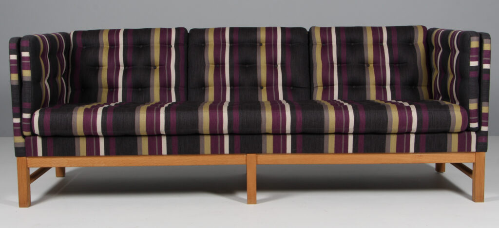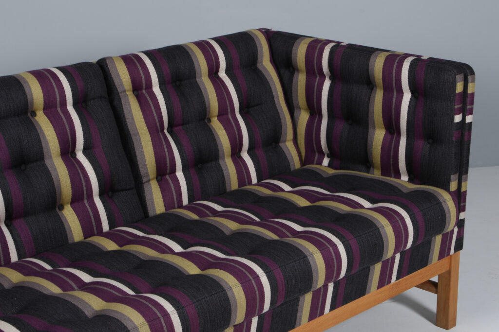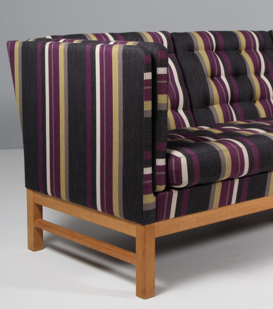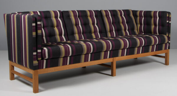 Erik Jørgensen tre personers sofa original betrukket med stribet Fanny Aronsen uldstof fra Kvadrat. Stel af sæbebehandlet eg. Model EJ315/3, fremstillet hos Erik Jørgensen. H. 76/43 B. 210 D. 77 cm