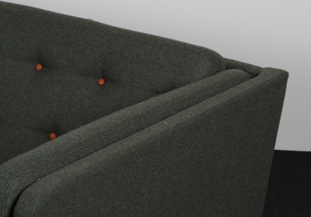 Erik Jørgensen tre personers sofa nybetrukket med bottle green Magrethe uld fra Nevotex knapper af cognac farvet smooth anilin læder. Stel af sæbebehandlet eg. Model EJ315, fremstillet hos Erik Jørgensen. H. 76/43 B. 210 D. 77 cm. Modelfoto, leveringstid kan forekomme