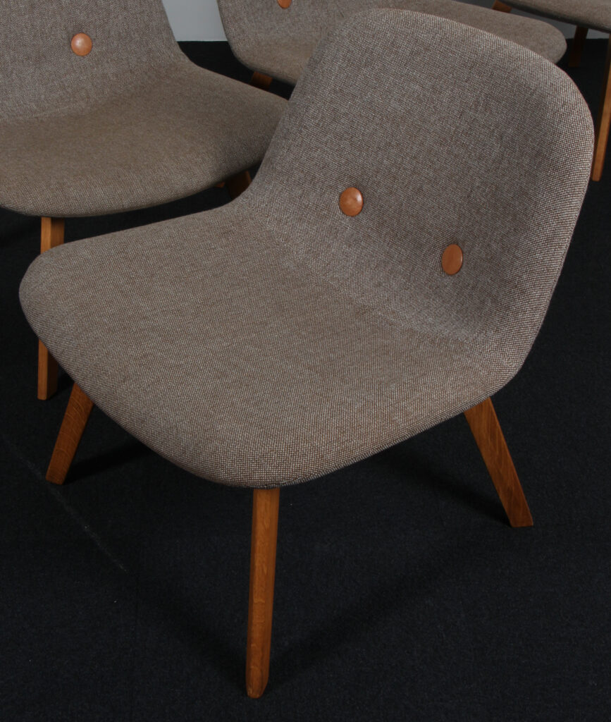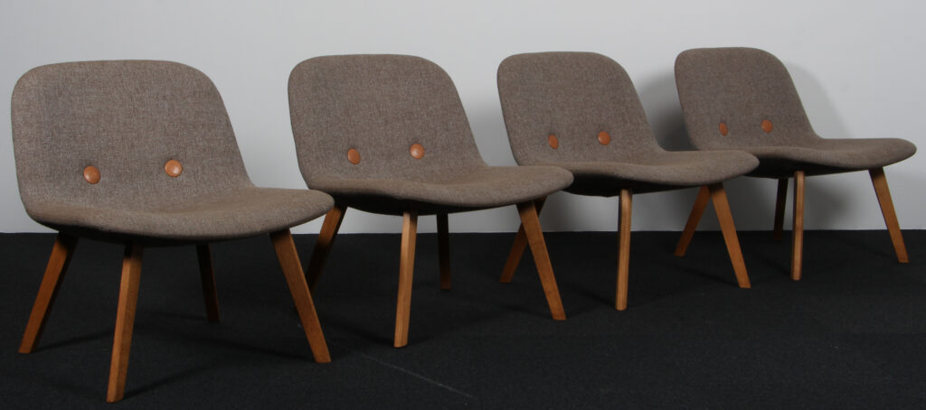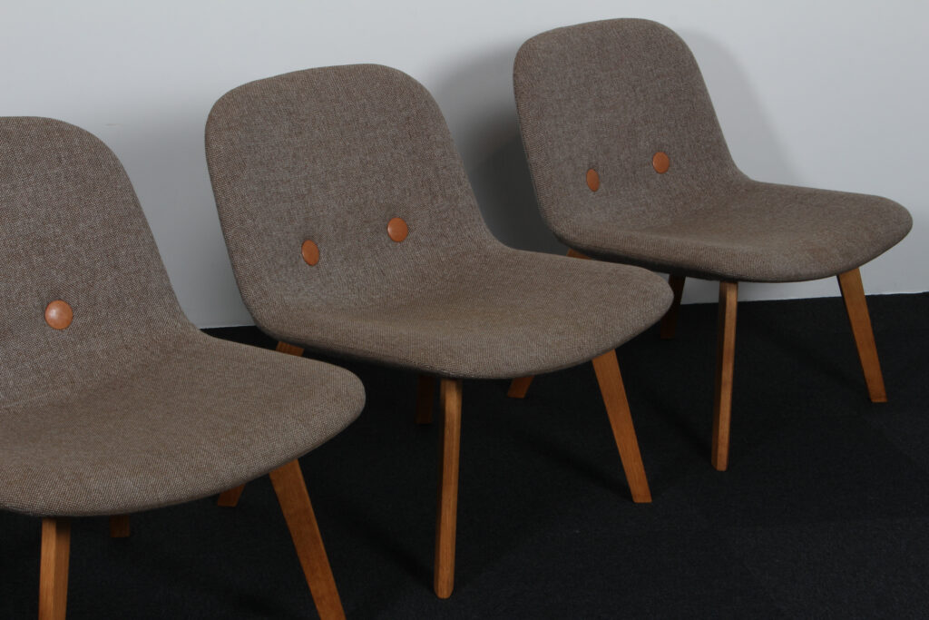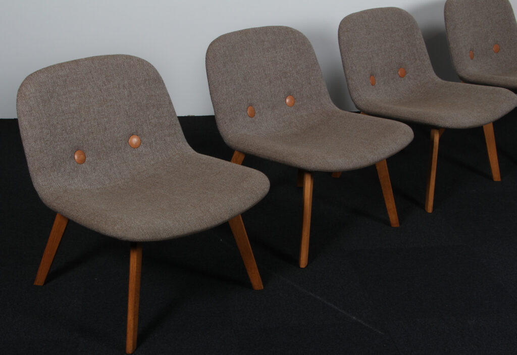 Foersom & Hiort-Lorenzen for Fredericia. Lænestole betrukket med Hallingdal, knapper af anilin læder. Ben samt armlæn af egetræ. Fremstillet hos Fredericia. H. 73/39 B. 65 D. 70 cm. Fremstår med lette brugsspor. Pris pr stk, flere haves.