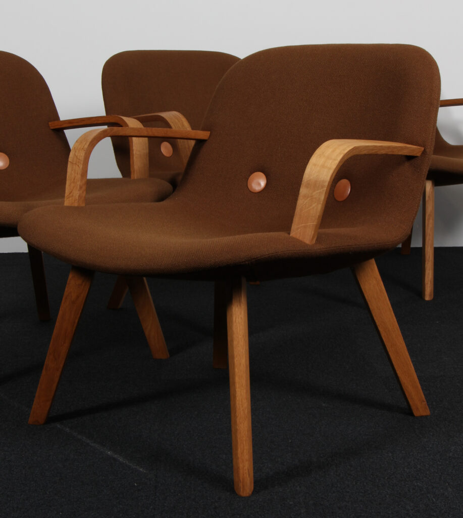 Foersom & Hiort-Lorenzen for Fredericia. Lænestole med armlæn betrukket med Hallingdal, knapper af anilin læder. Ben samt armlæn af egetræ. Fremstillet hos Fredericia. H. 73/39 B. 65 D. 70 cm. Fremstår med lette brugsspor. Pris pr stk, flere haves.