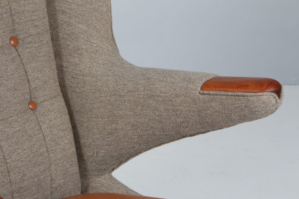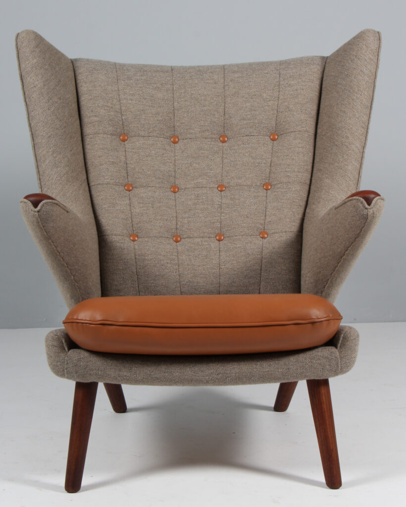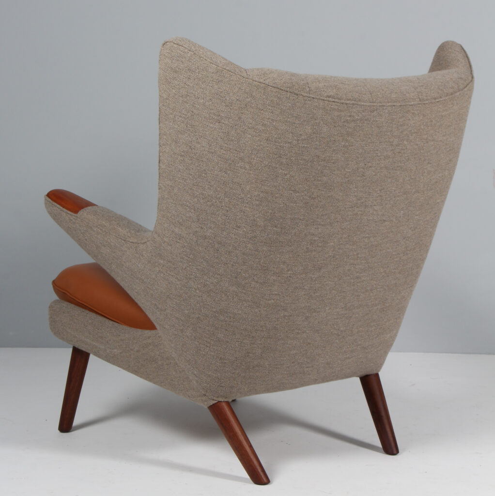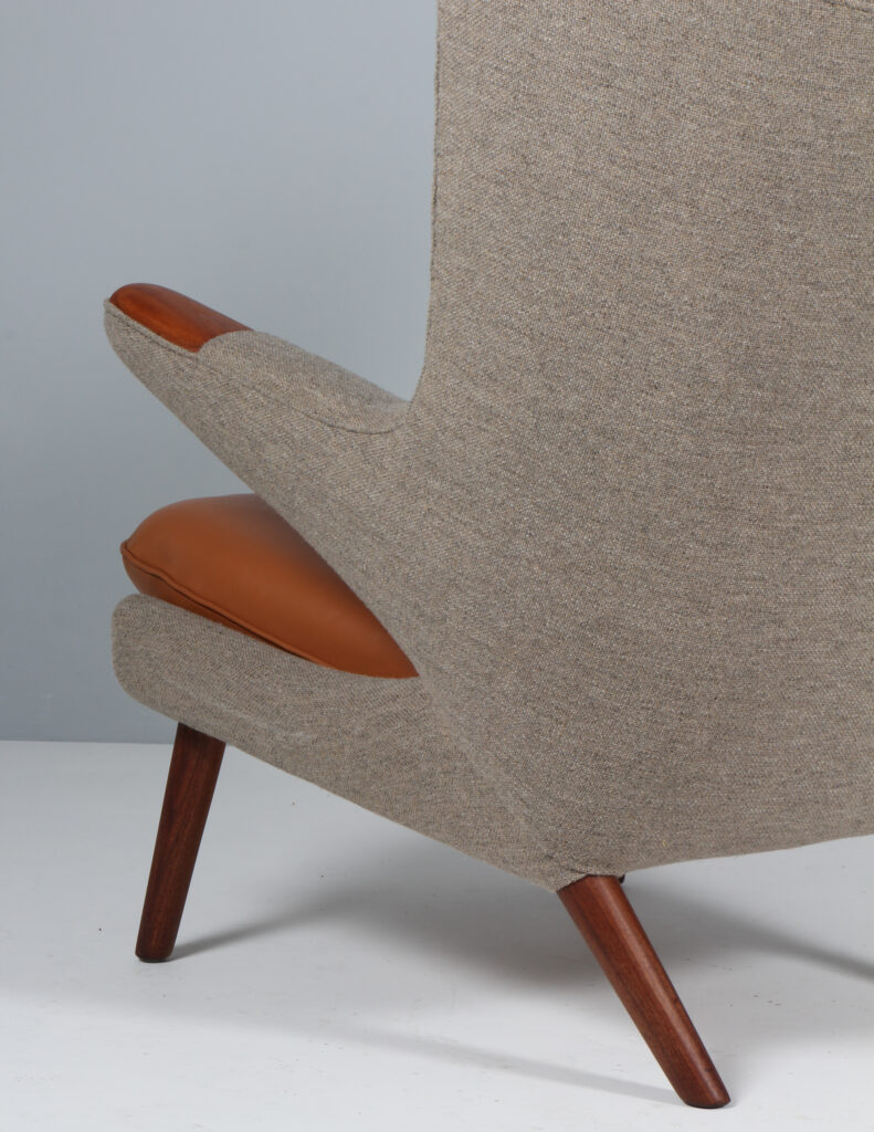 Hans J. Wegner Bamesestol med ben og negle af teak. Nybetrukket med Hallingdal 227 fra Kvadrat. Sæde og knapper af Walnut Elegance anilin læder fra Arne Sørensen. Model AP19, fremstillet hos AP stolen. H. 100/43 B. 91 D. 90 cm.