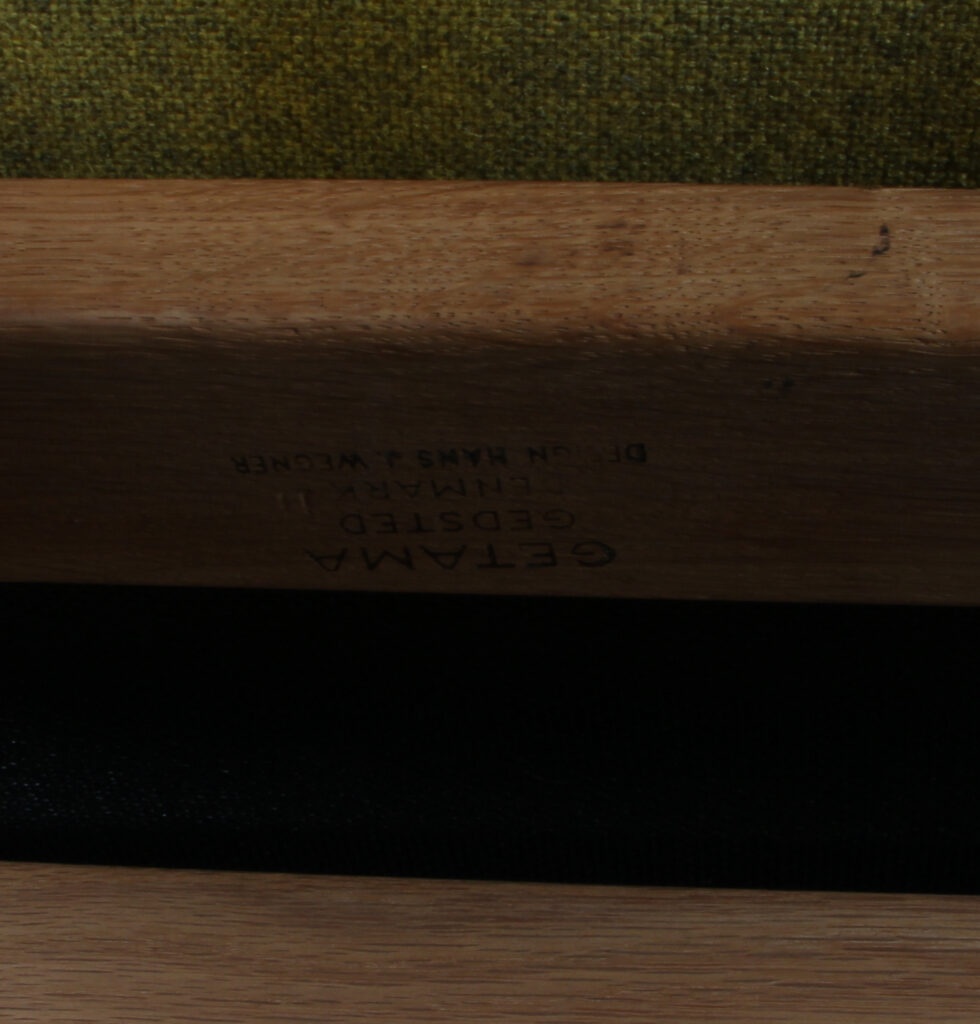 Hans J. Wegner højrygget lænestol model GE375, sæbebehandlet eg og uldstof