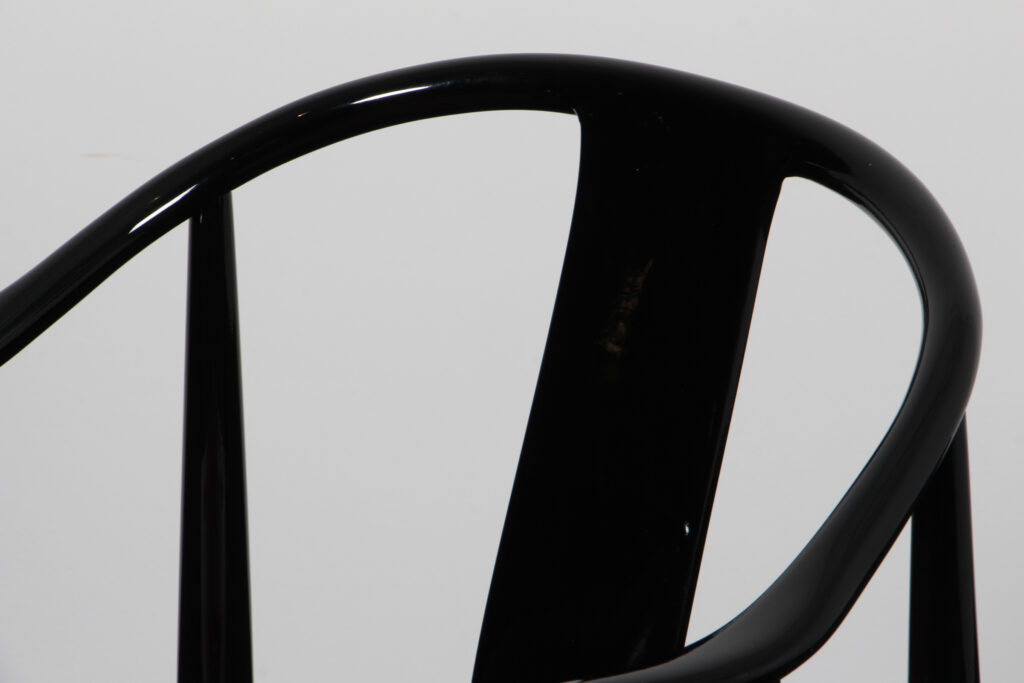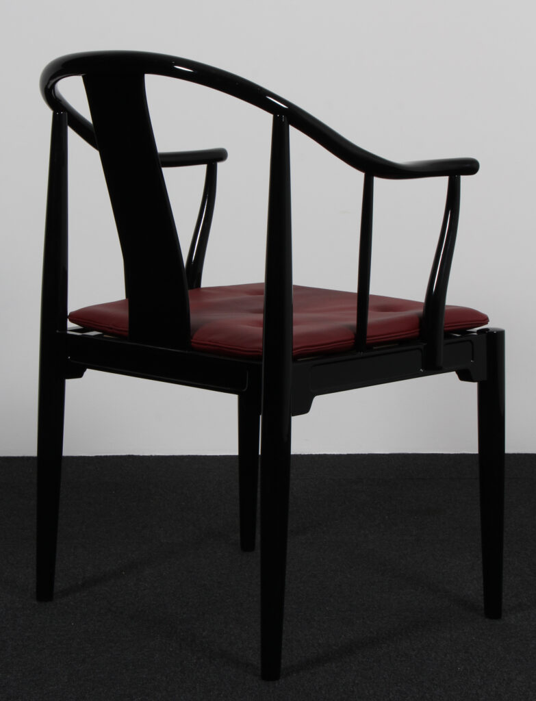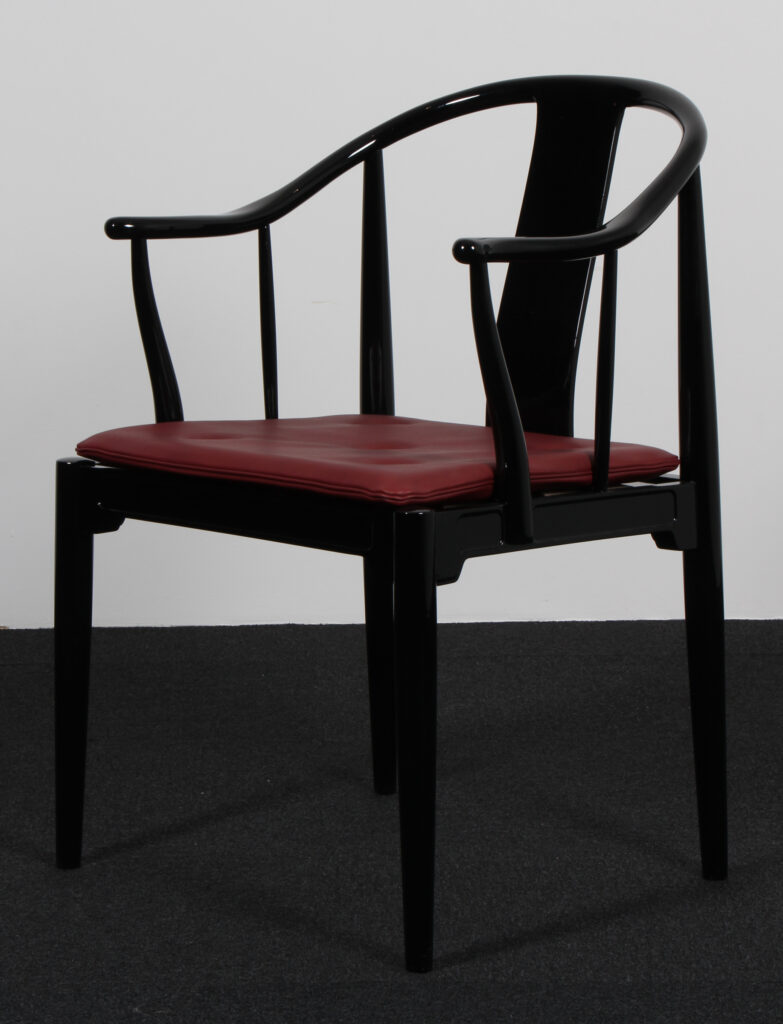 Hans J. Wegner Kinastol af piano sort lak. Nybetrukket hynde med indian red elegance anilin læder. Model 4283, fremstillet hos Fritz Hansen. H. 81/46 B. 57 D. 52 cm. Fremstår med lette brugsspor.
