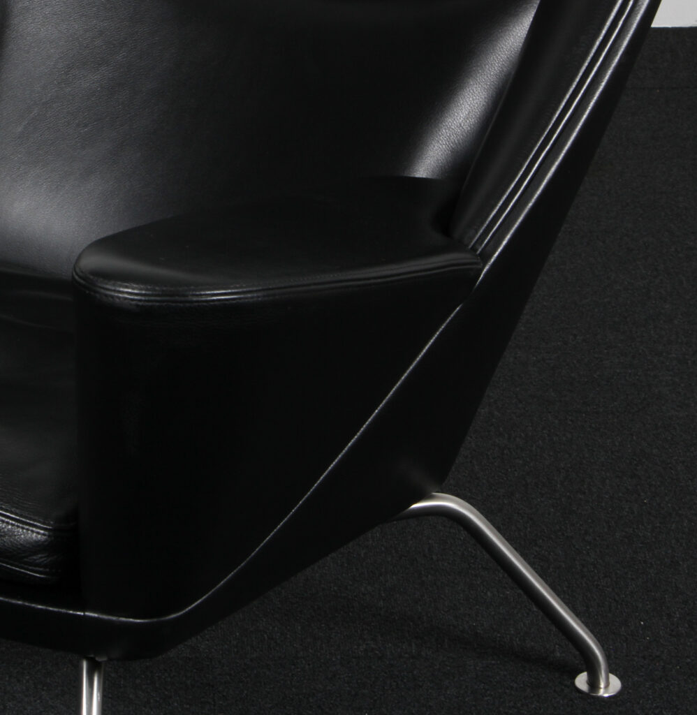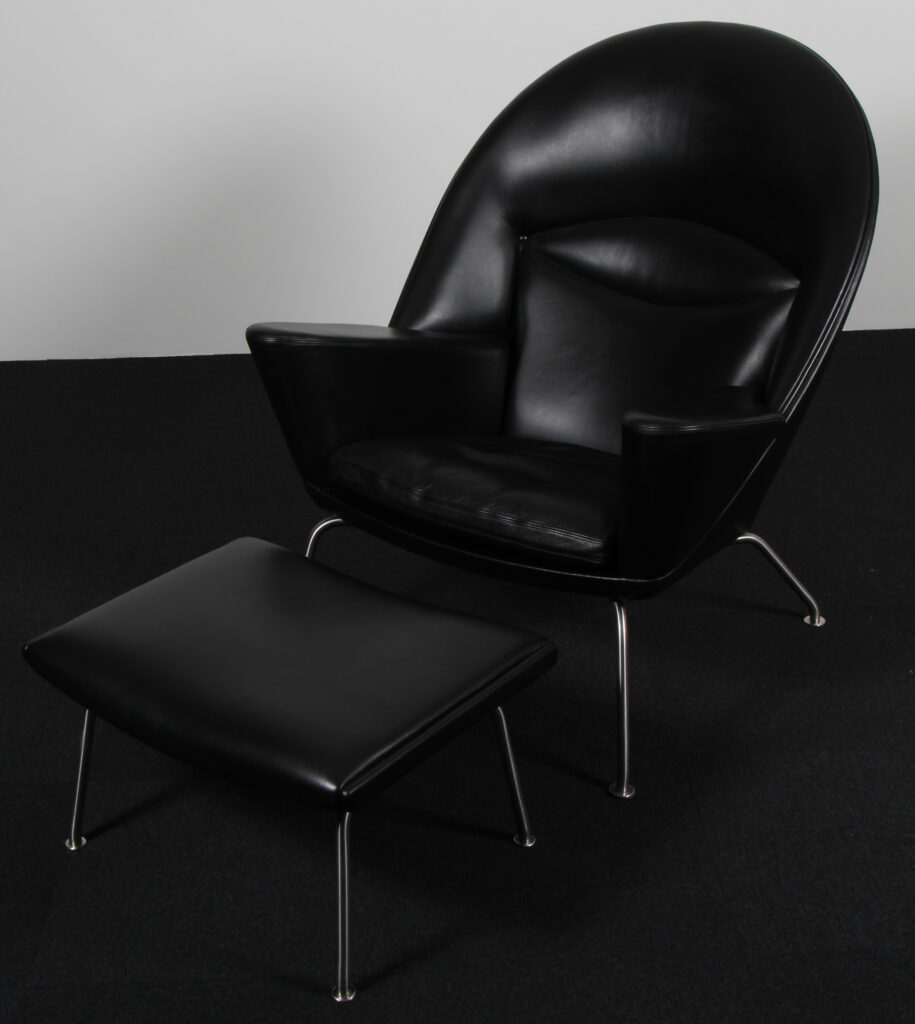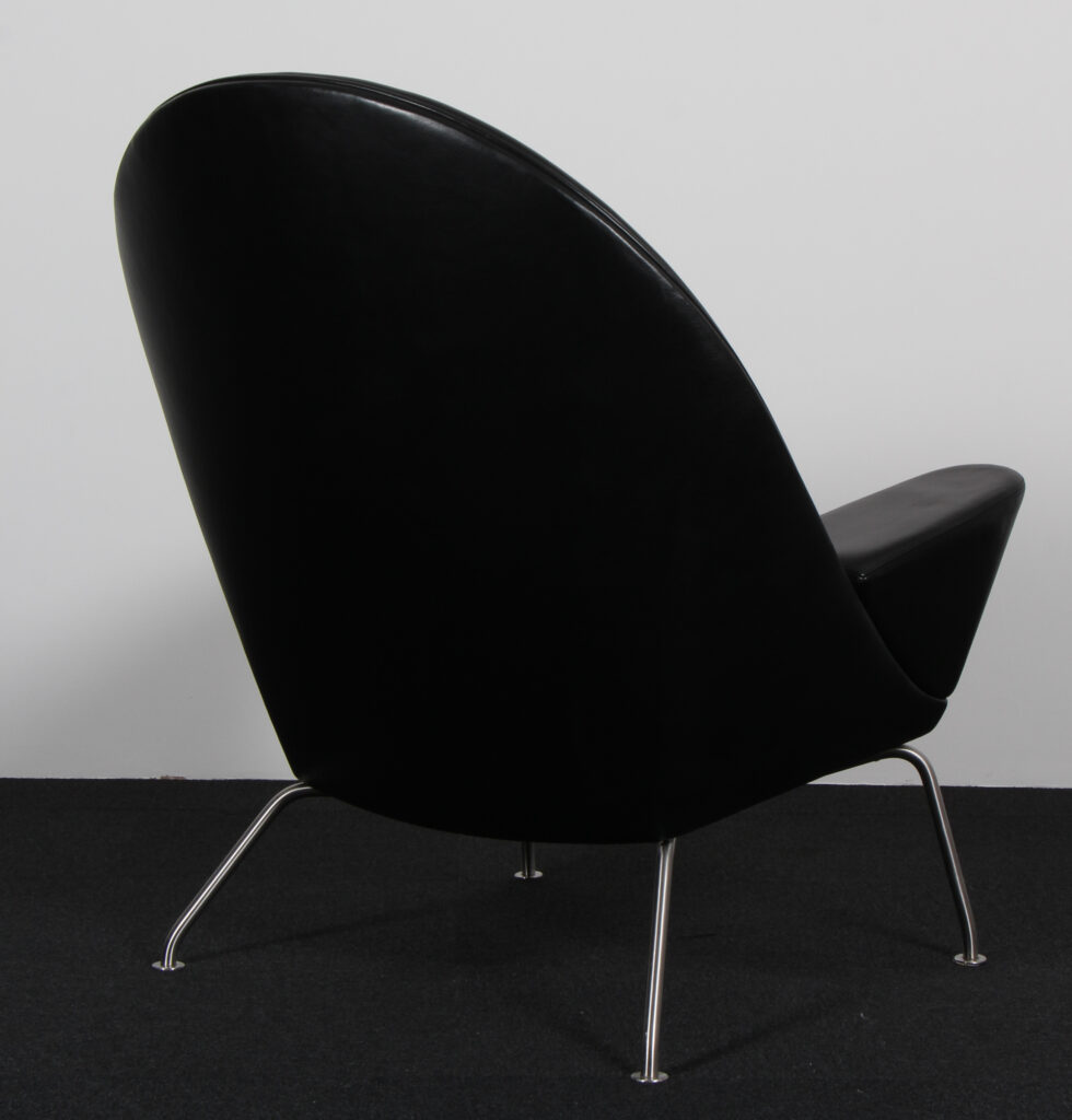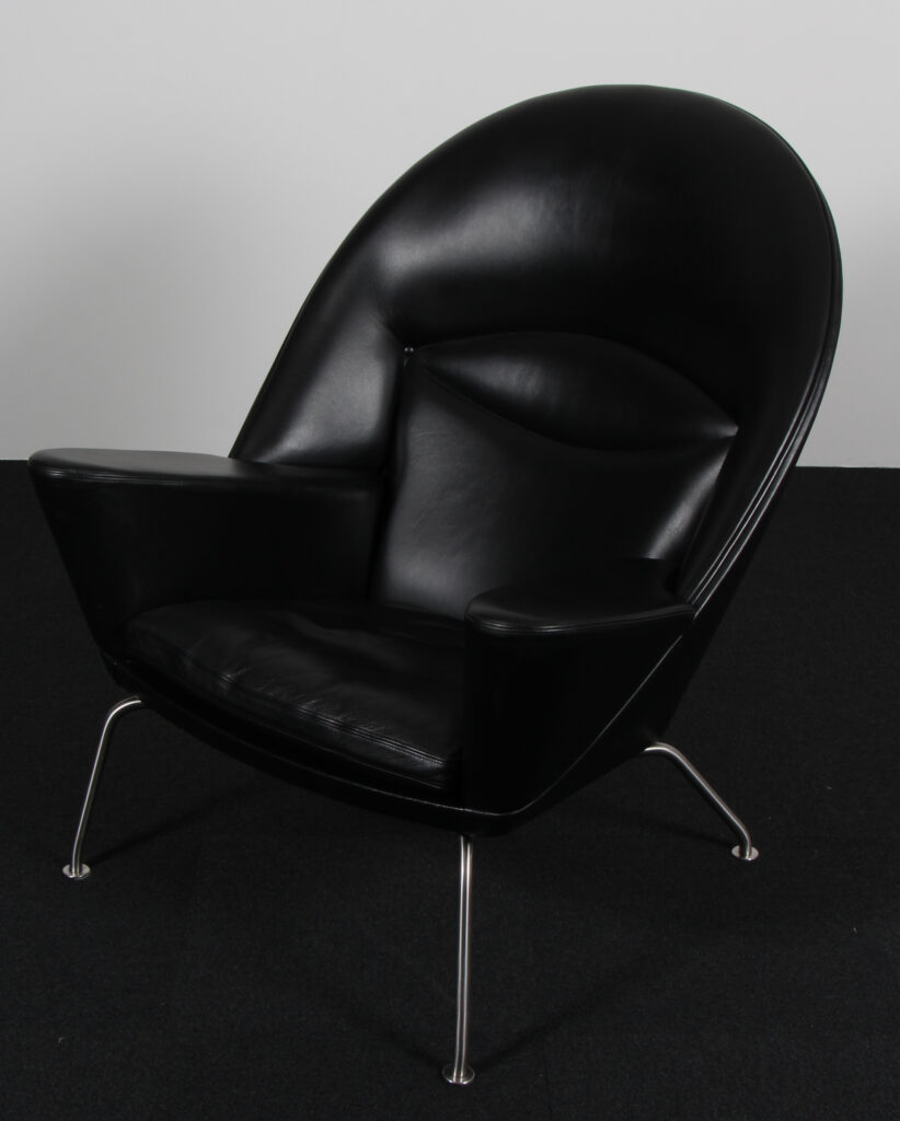 Hans J. Wegner Oculus lænestol samt skammel. Original betrukket med sort læder. Ben af børstet stål. Model CH468, fremstillet hos Carl Hansen. H. 105/42 B. 90 D. 90 cm. Fremstår med lette brugsspor