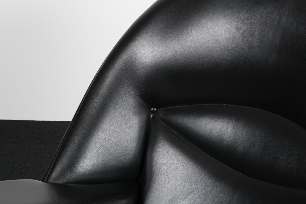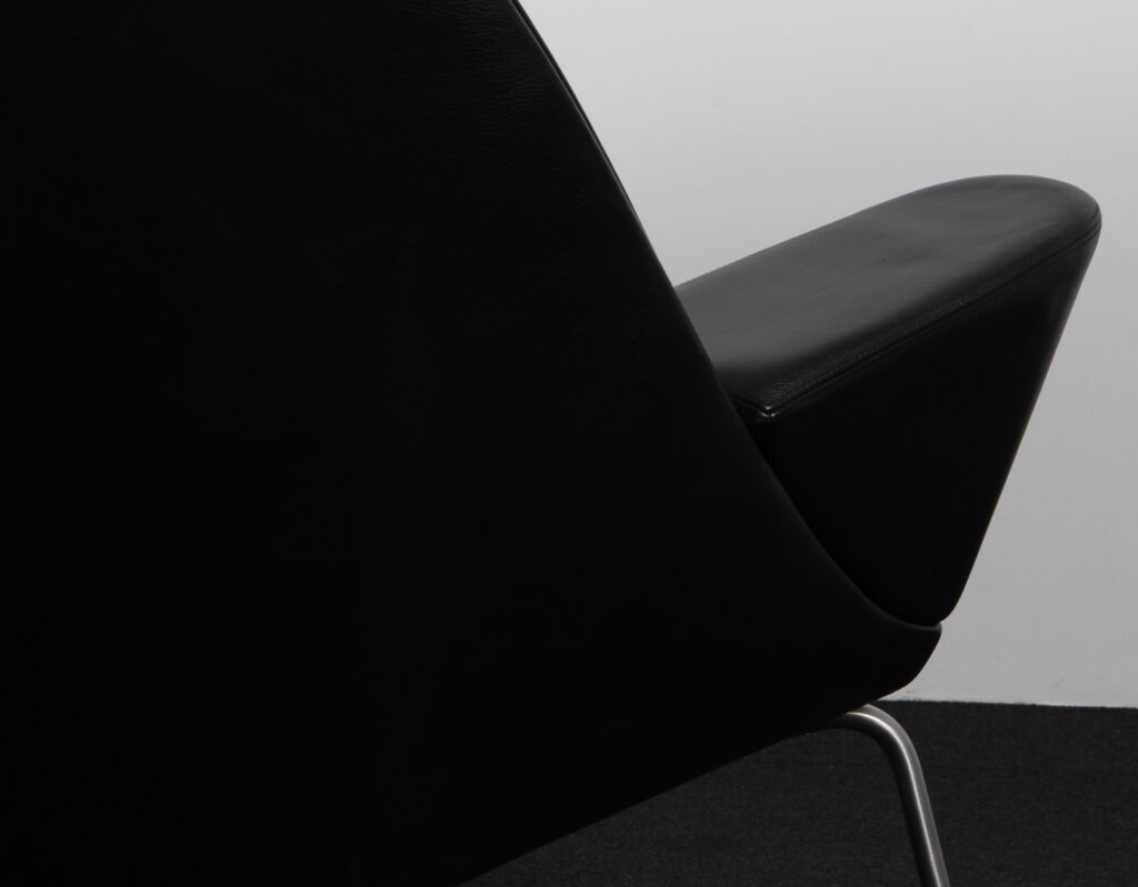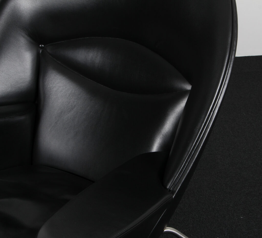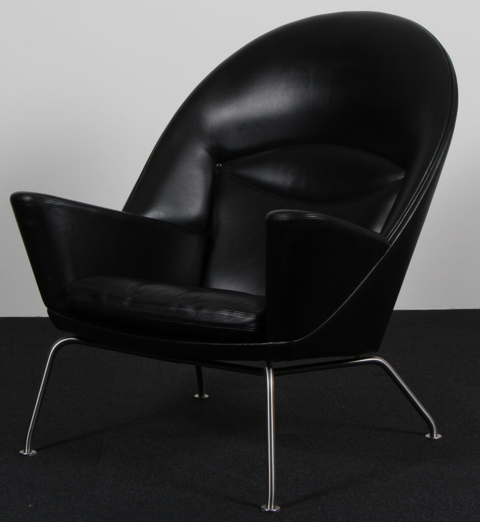 Hans J. Wegner Oculus lænestol samt skammel. Original betrukket med sort læder. Ben af børstet stål. Model CH468, fremstillet hos Carl Hansen. H. 105/42 B. 90 D. 90 cm. Fremstår med lette brugsspor