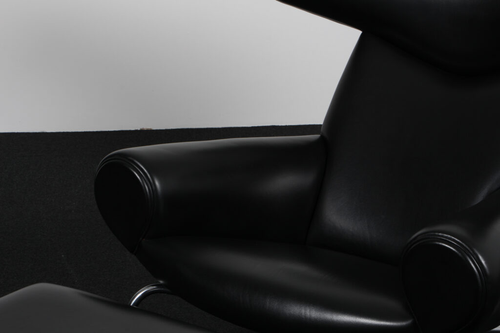 Hans J. Wegner Ox Chair samt skammel original betrukket med let patineret sort læder. Ben af stål. Model Ox Chair, fremstillet hos Erik Jørgensen. H. 86/35 B. 95 D. 90 cm.