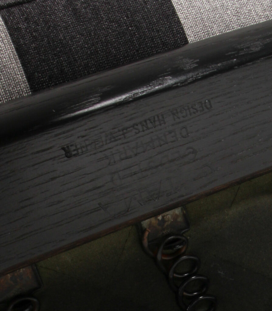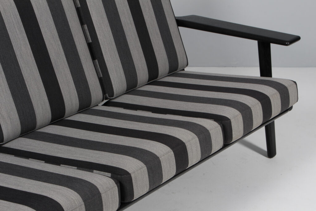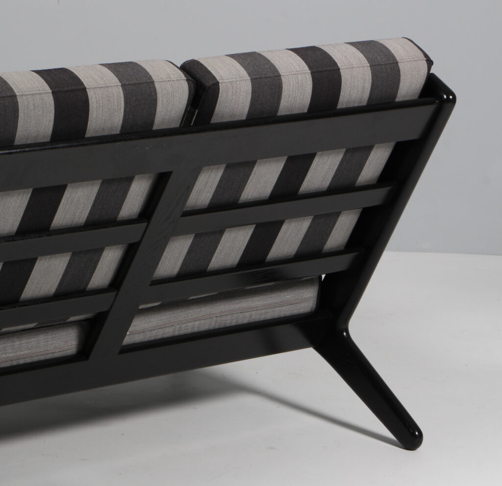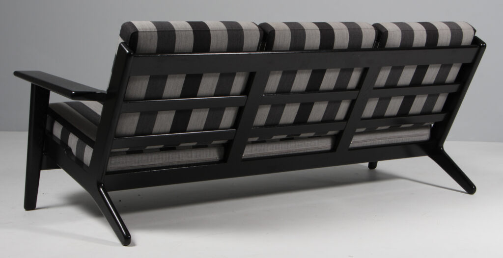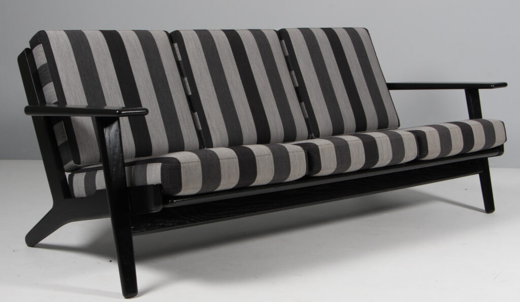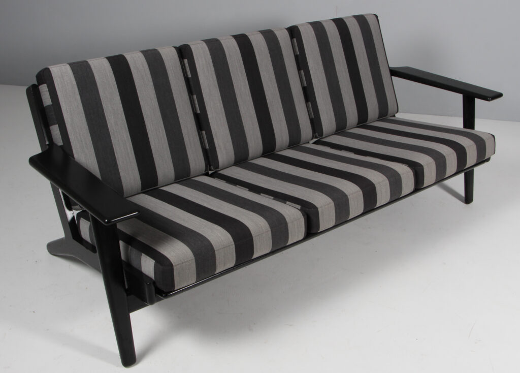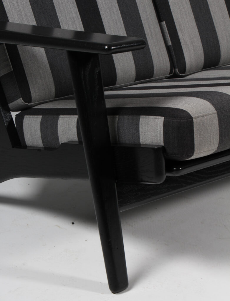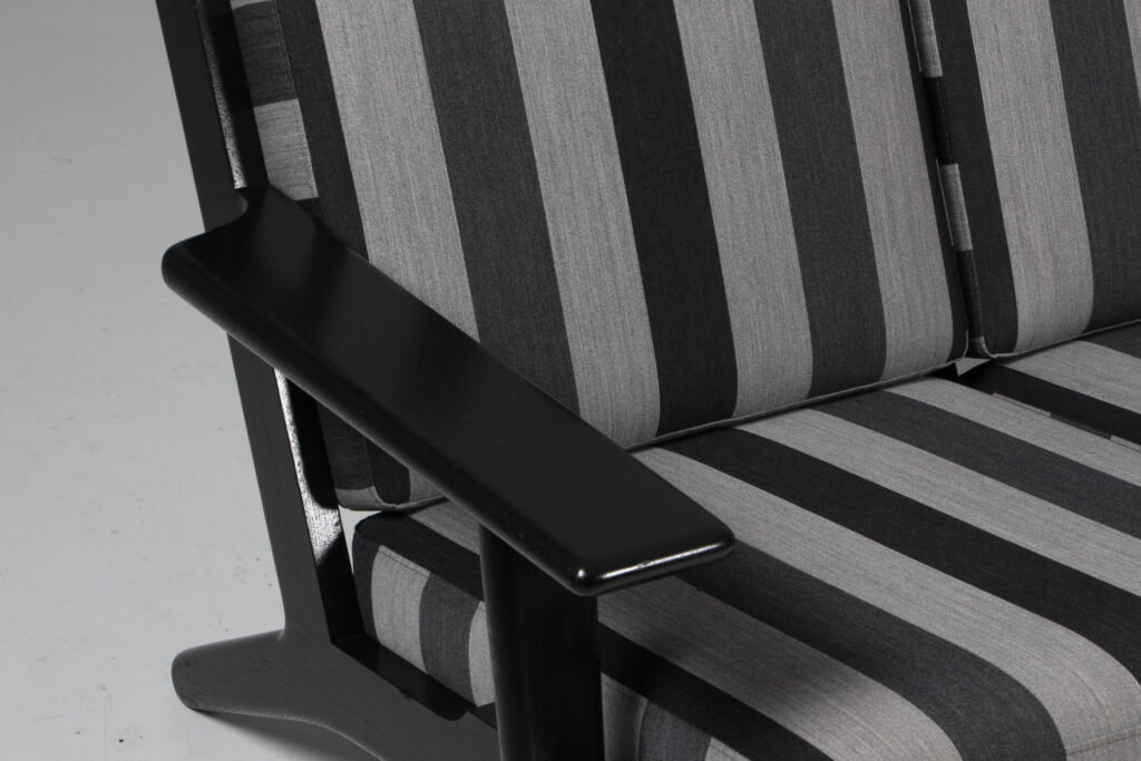 Hans J. Wegner tre personers sofa model GE-290/3 af sortlakeret eg. Betrukket med stribet stof. Fremstillet hos Getama. H. 71 cm Sh. 40 cm B. 180 cm. D. 76 cm. Fremstår med minimale brugsspor alder taget i betragtning