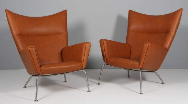 Hans J. Wegner Wing Chair nybetrukket med walnut elegance. Ben af børstet stål. Model Wing Chair CH445, fremstillet hos Carl Hansen. H. 104/39 B. 80 D. 92 cm. Pris pr stk.