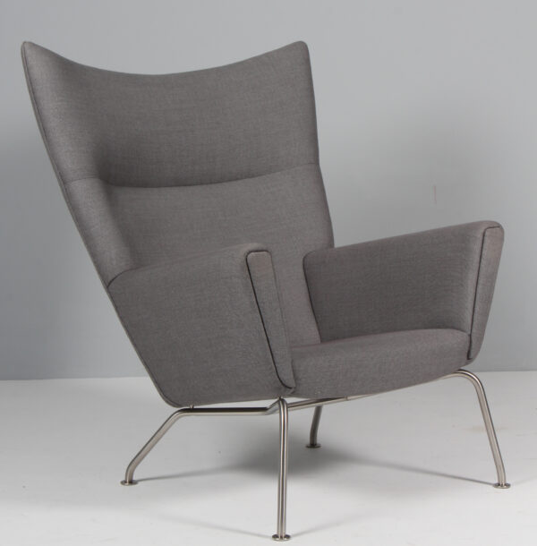 Hans J. Wegner Wing Chair original betrukket med stof. Ben af børstet stål. Model Wing Chair CH445, fremstillet hos Carl Hansen. H. 104/39 B. 80 D. 92 cm.