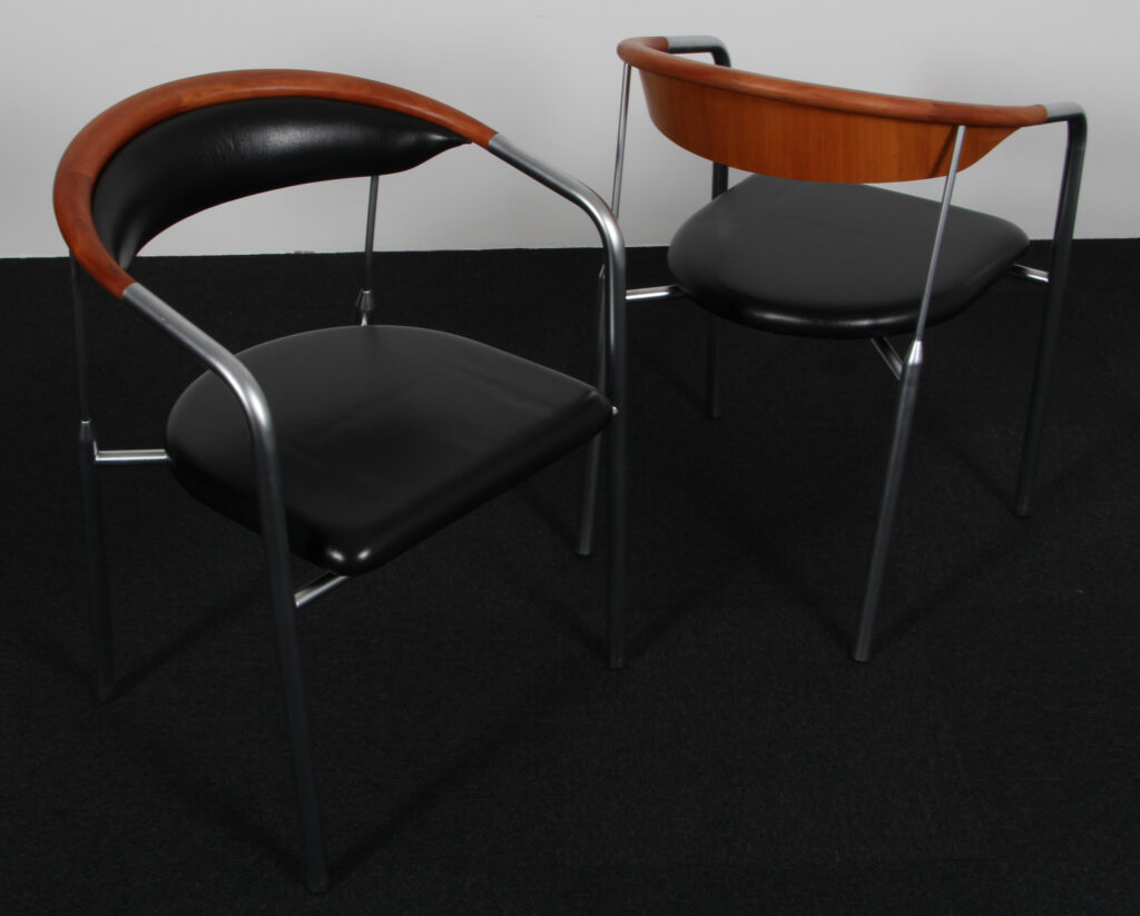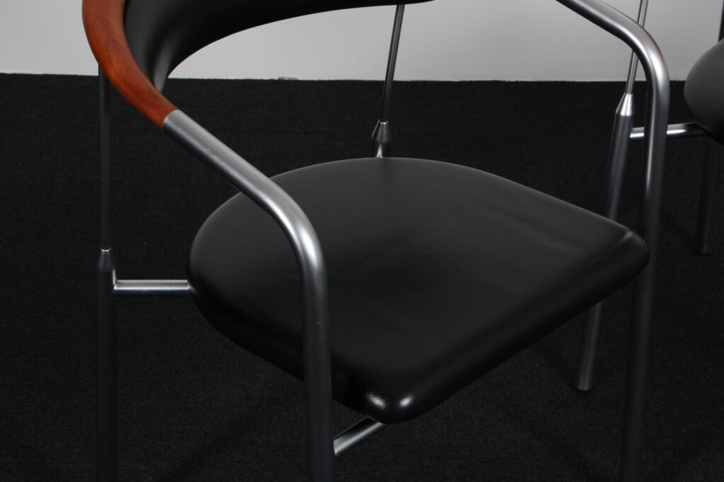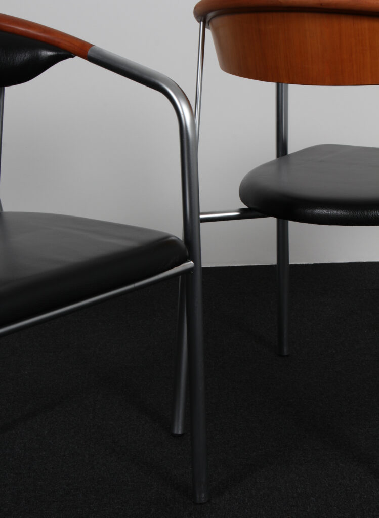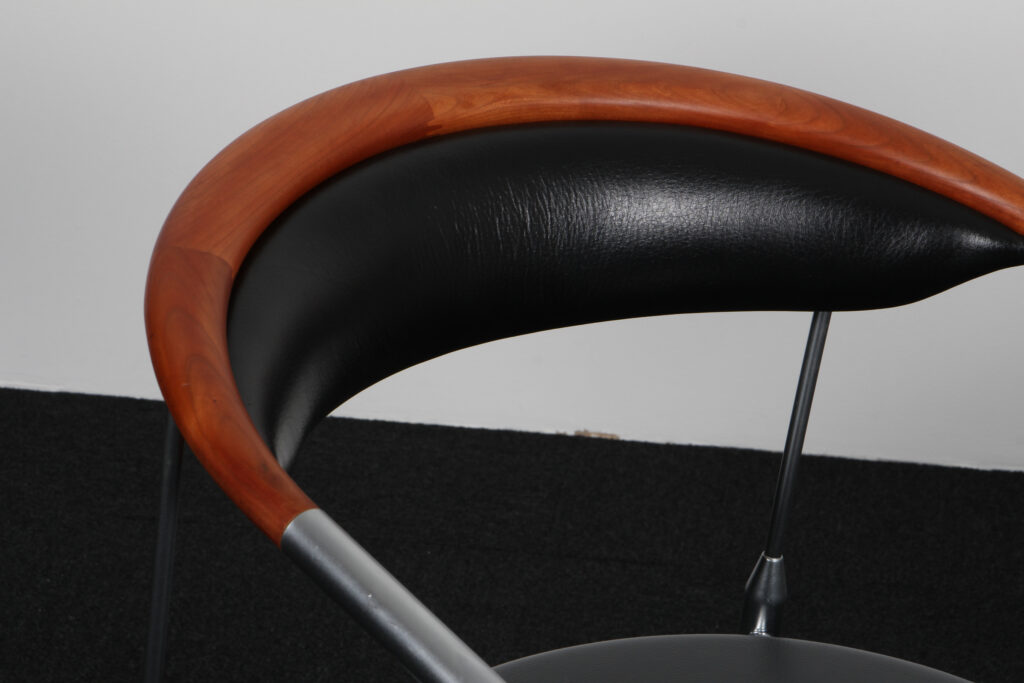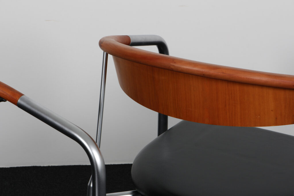 Henrik Tengler. Armstole, model Chairman med stel af børstet stål, kopstykke af olieret mahogni, sæde og ryg betrukket med sort læder. Formgivet i 1991. Fremstillet hos Hansen & Sørensen.