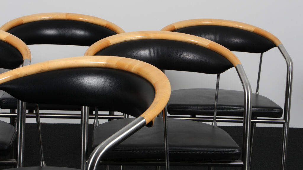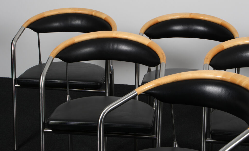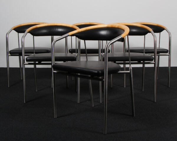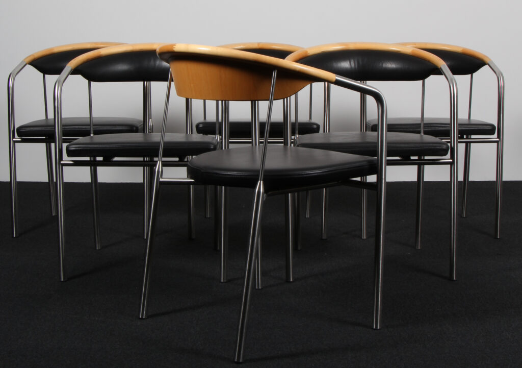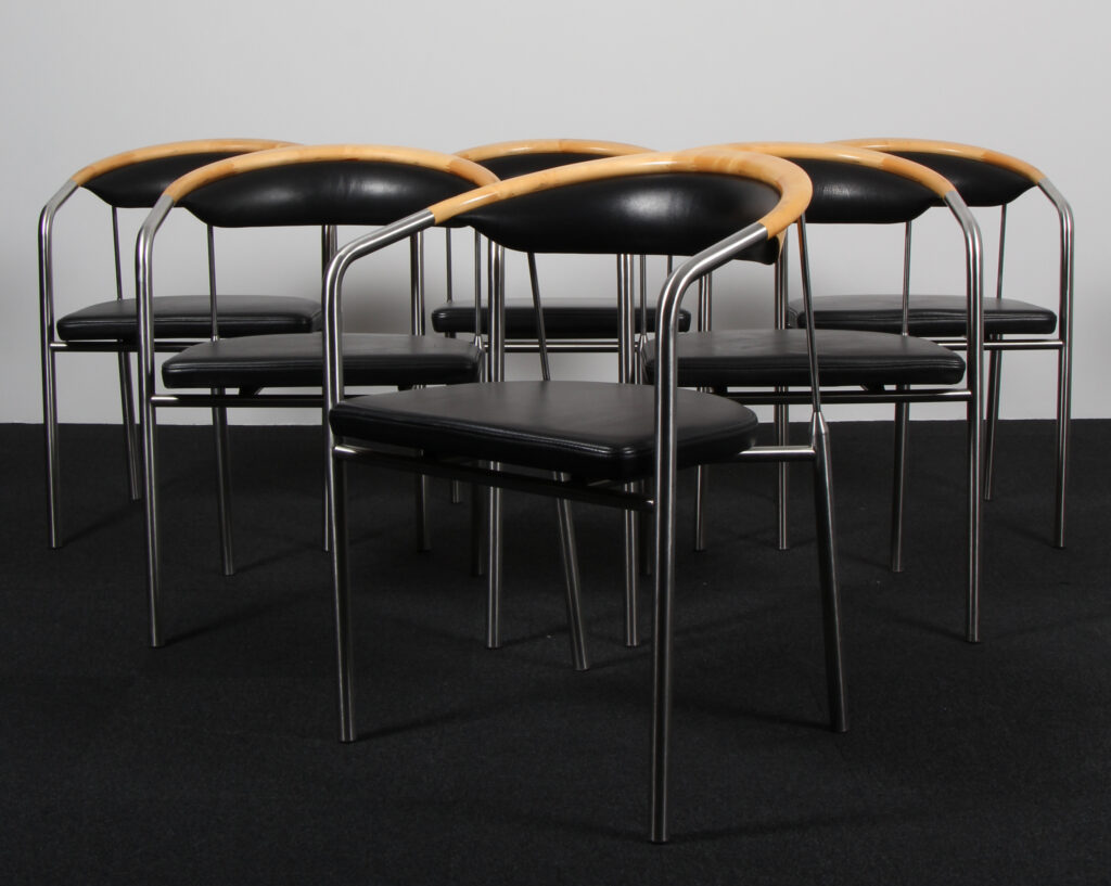 Henrik Tengler. Sæt på seks armstole, model Chairman med stel af børstet stål, kopstykke af ahorn, sæde og ryg original betrukket med sort læder. Formgivet i 1991. Fremstillet hos Hansen & Sørensen.