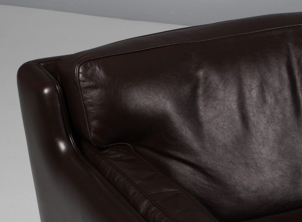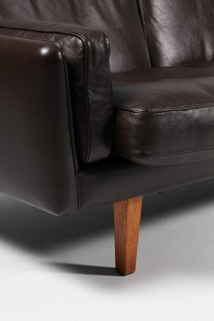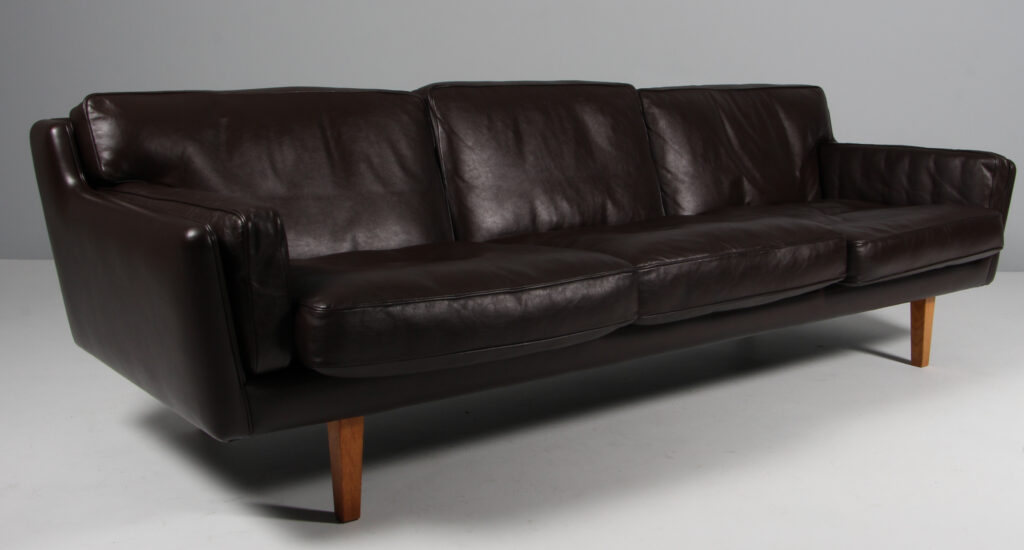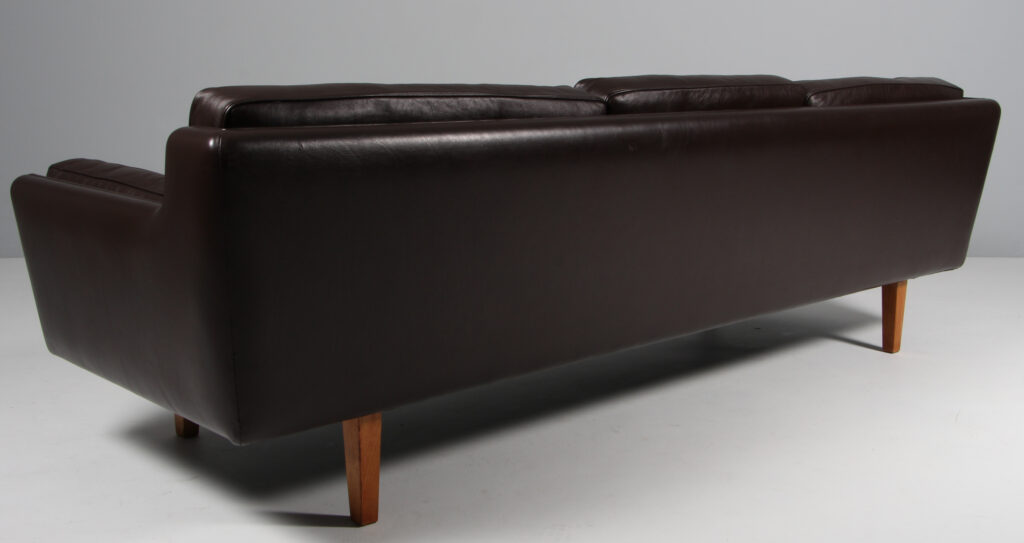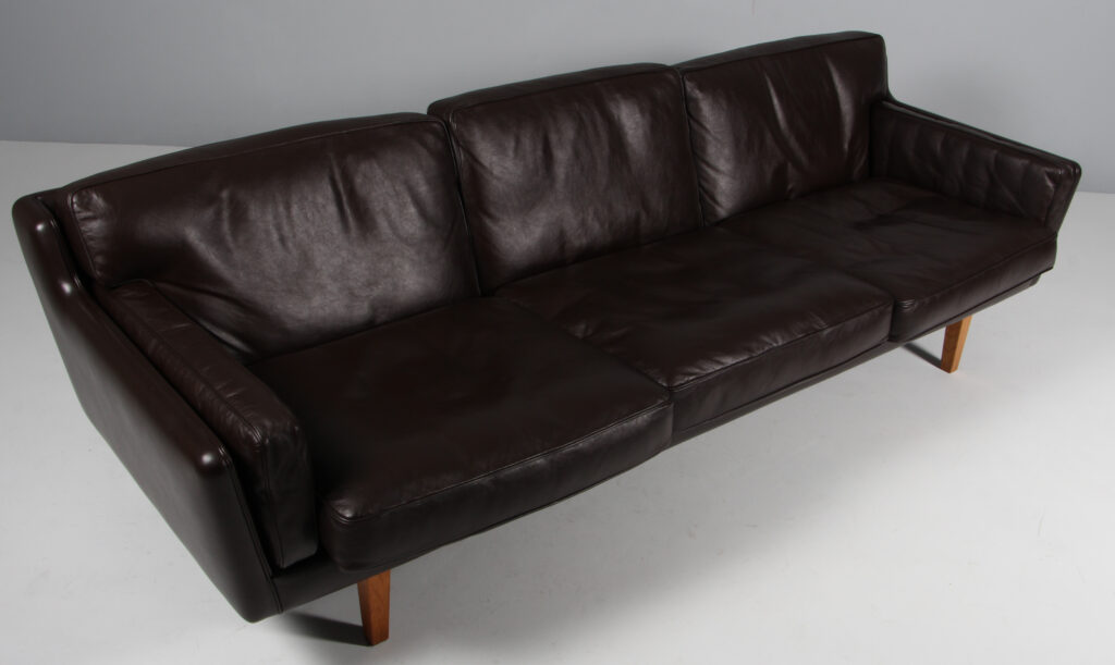 Illum Wikkelsø tre personers sofa original betrukket med brunt læder, dunhynder. Pyramide ben af eg. Model V11A, fremstillet hos Holger Christiansen. H. 65/40 B. 220 D. 80. Fremstår med minimale brugsspor alder taget i betragtning