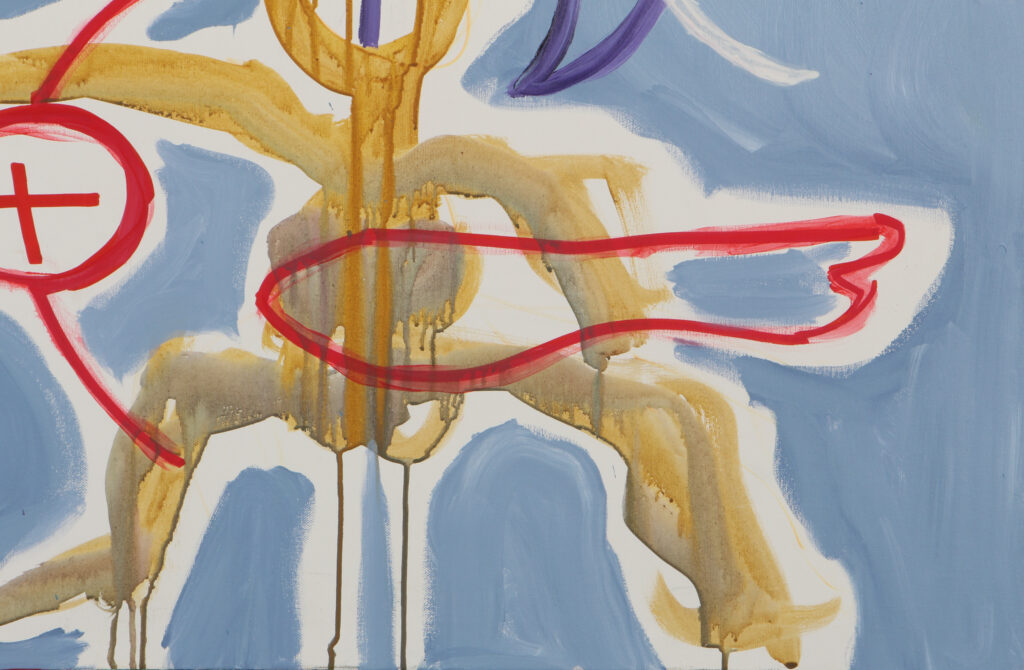 Jesper “Jokeren” Dahl, figurativ komposition. Signeret, dateret samt betitlet verso “Surf’s up”. B. 80 H. 60 cm.