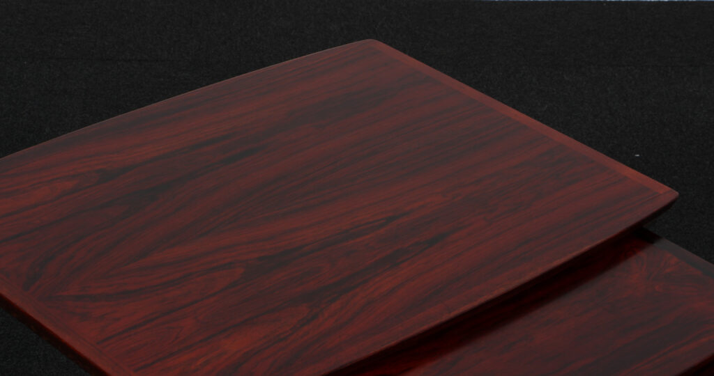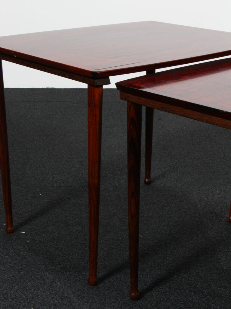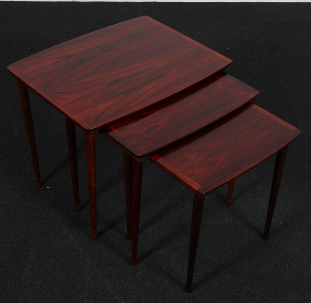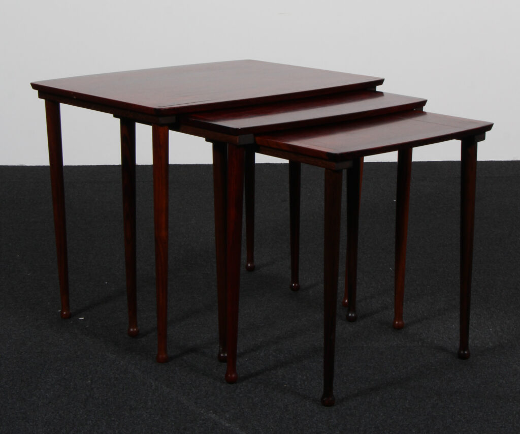 Jørgen Aakjær sæt på tre indskudsborde af palisander. H. 46 B. 55 D. 44 cm. Fremstår med lette brugsspor.