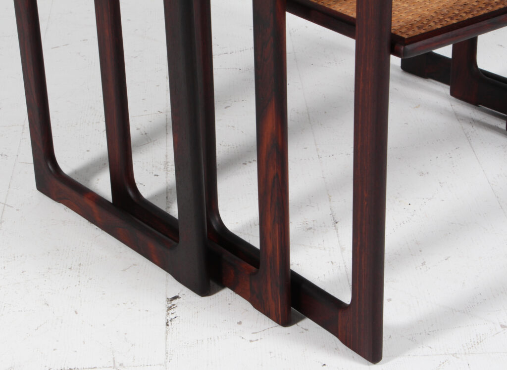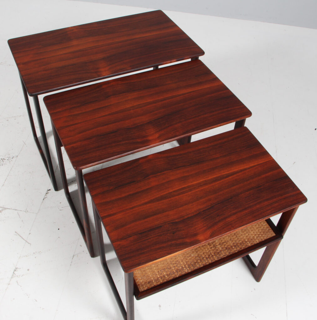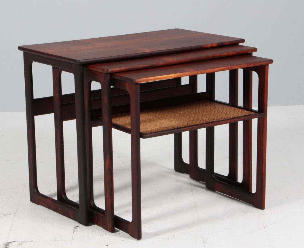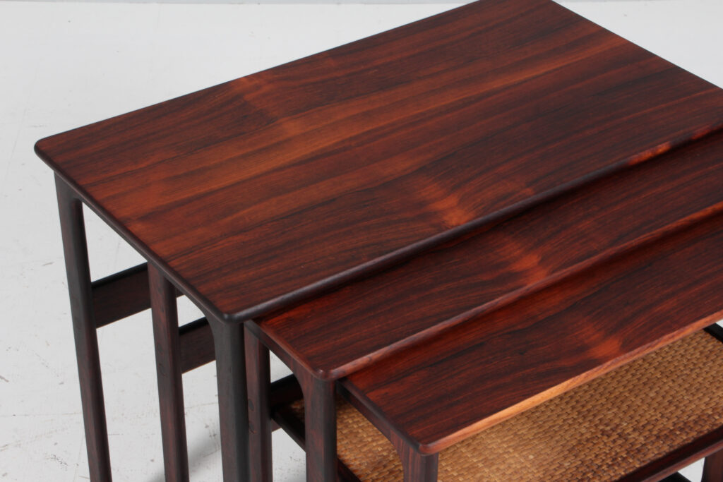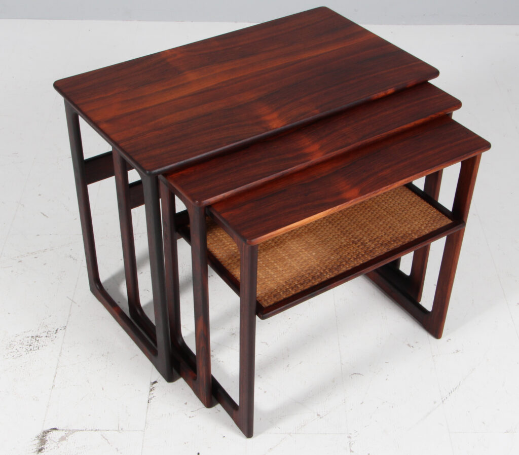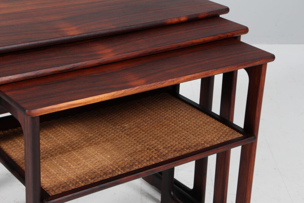 Johannes Andersen indskudsborde af palisander med hylde af flet. Fremstillet hos CFC Silkeborg. H. 53 B. 65 D. 37 cm. Fremstår nyrenoveret