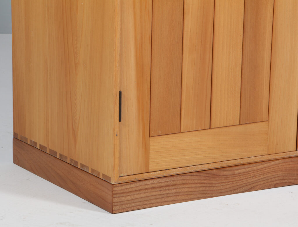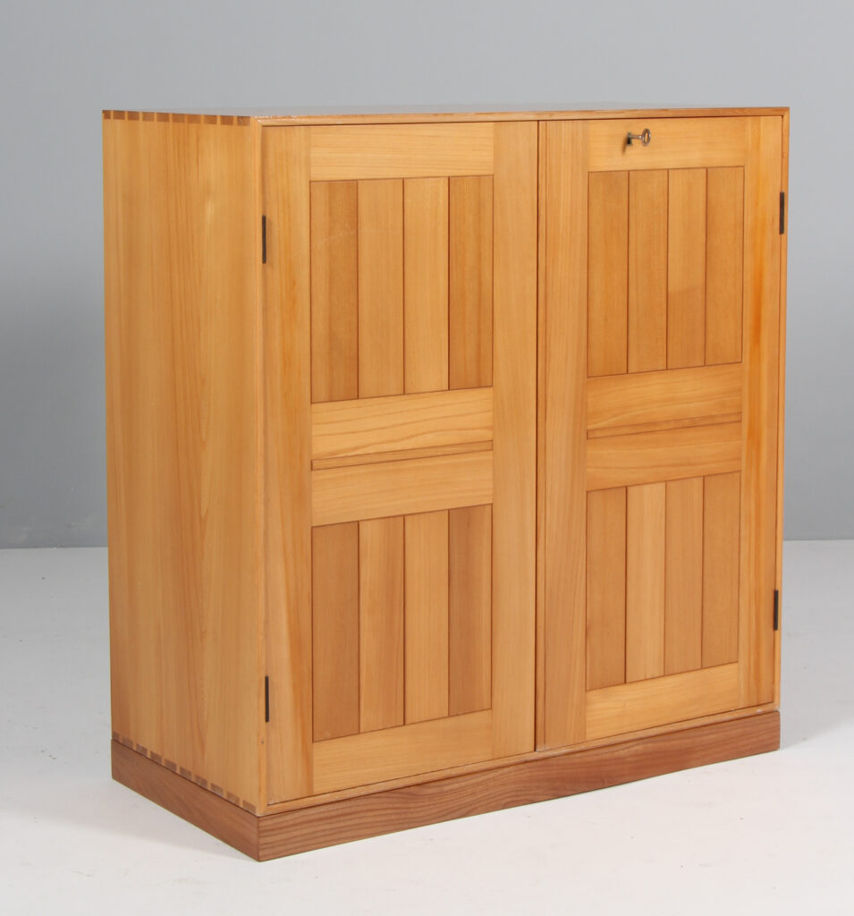 Mogens Koch for Rud Rasmussen Skab af massiv elm. Med ruminddeling, nøgle medfølger. Profileringer på kanter samt fingertappede samlinger. Fremstillet hos Rud Rasmussen, med mærkat herfra. H. 76 +5 cm B. 76 D. 36. Fremstår med ny lak på toppen.