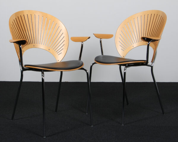 Nanna Ditzel par Trinidad armstole med skal af ahorn. Nybetrukket med sort anilin læder. Stel af forkromet stål. Model Trinidad, fremstillet hos Fredericia Furniture. H. 82/44 B 63 D. 55 cm.