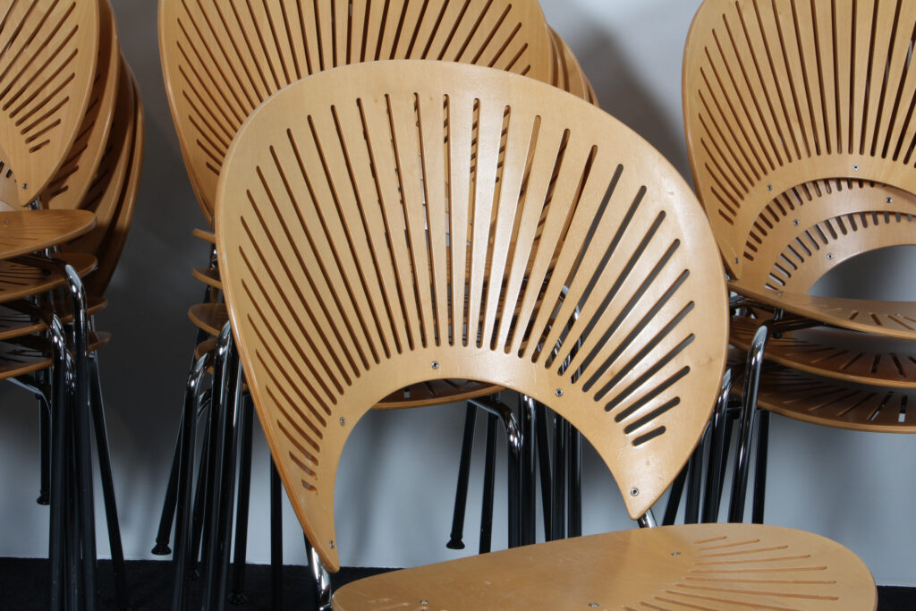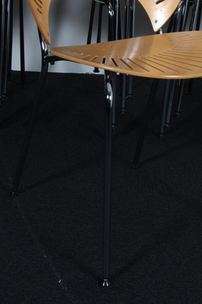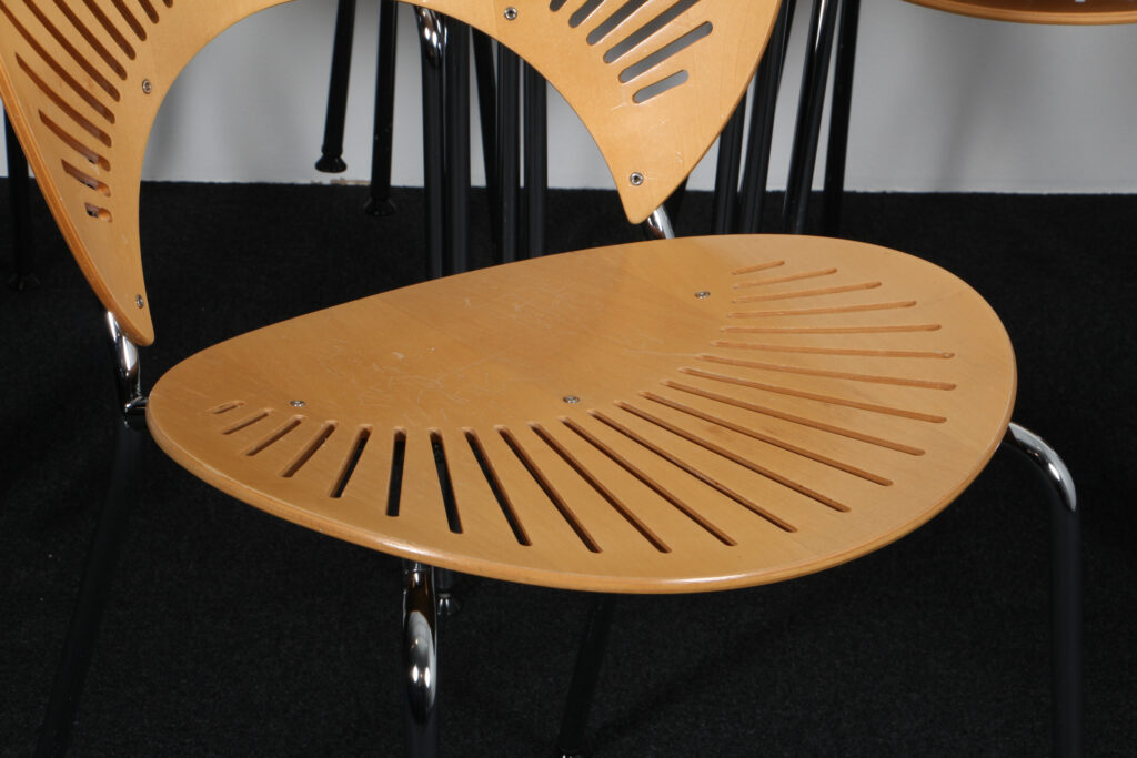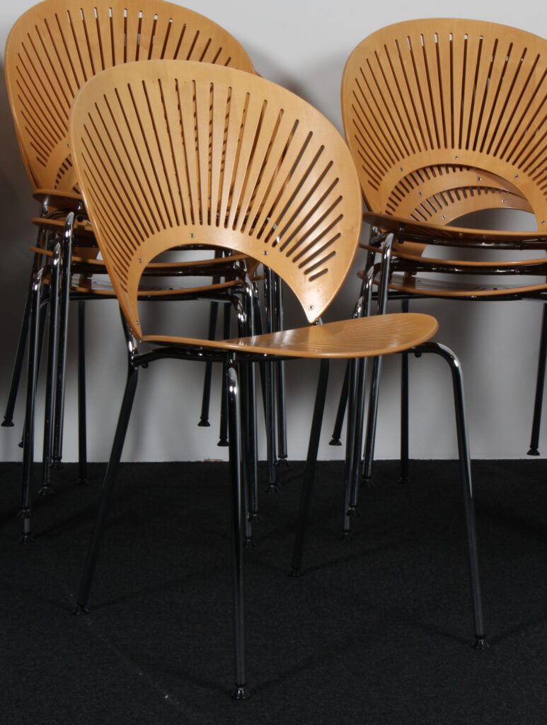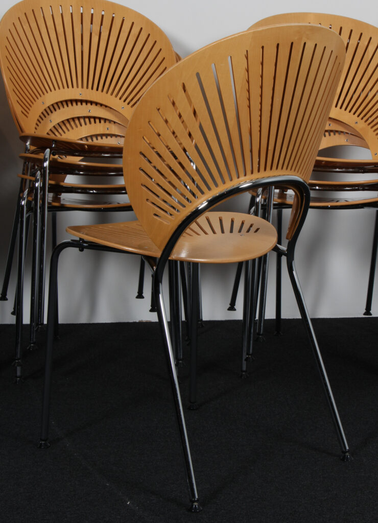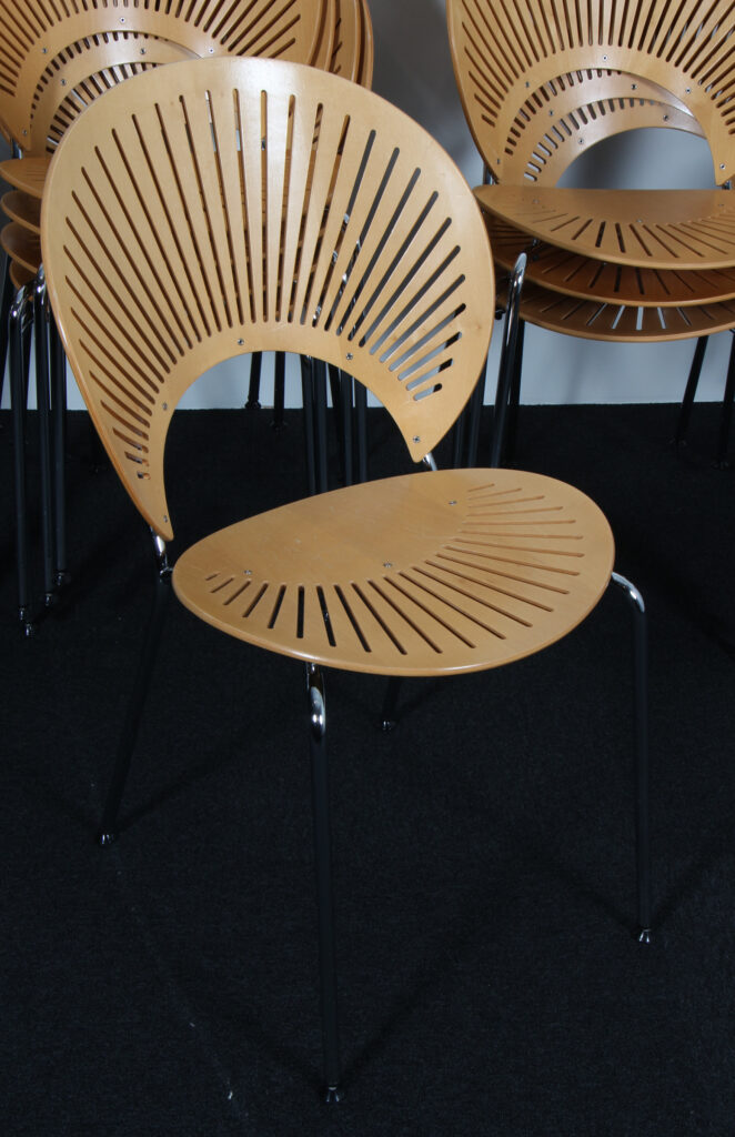 Nanna Ditzel stole udført i fineret ahorn. Stel af forkromet stål. Model Trinidad, Fremstillet hos Frederica Furniture. H. 84/45 B. 44 D. 55 cm. Fremstår med brugsspor. Pris pr stk
