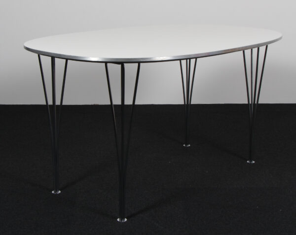Piet Hein & Bruno Mathsson super ellipse bord af original laminat, alukant. Forkromet spændben. Fremstillet hos Fritz Hansen. H. 70 B. 90 L. 130 cm. Fremstår med lette brugsspor.
