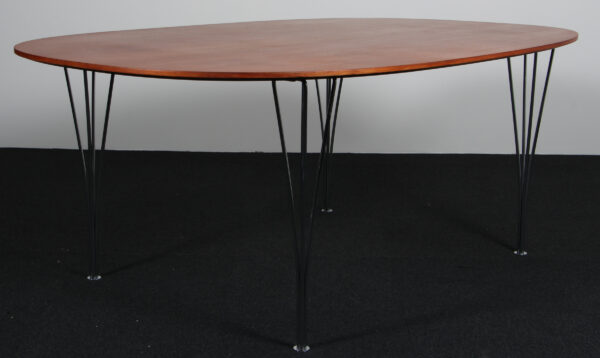 Piet Hein & Bruno Mathsson spisebord af fineret teak. Spændben af forkromet stål. Model Super Ellipse, fremstillet hos Fritz Hansen. H. 70 B. 120 L. 180 cm.