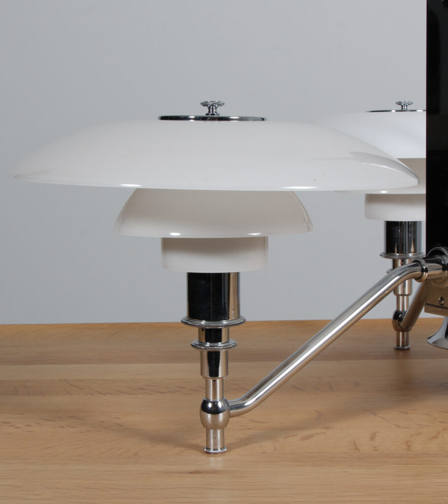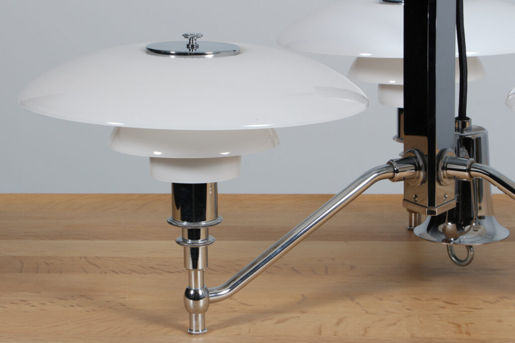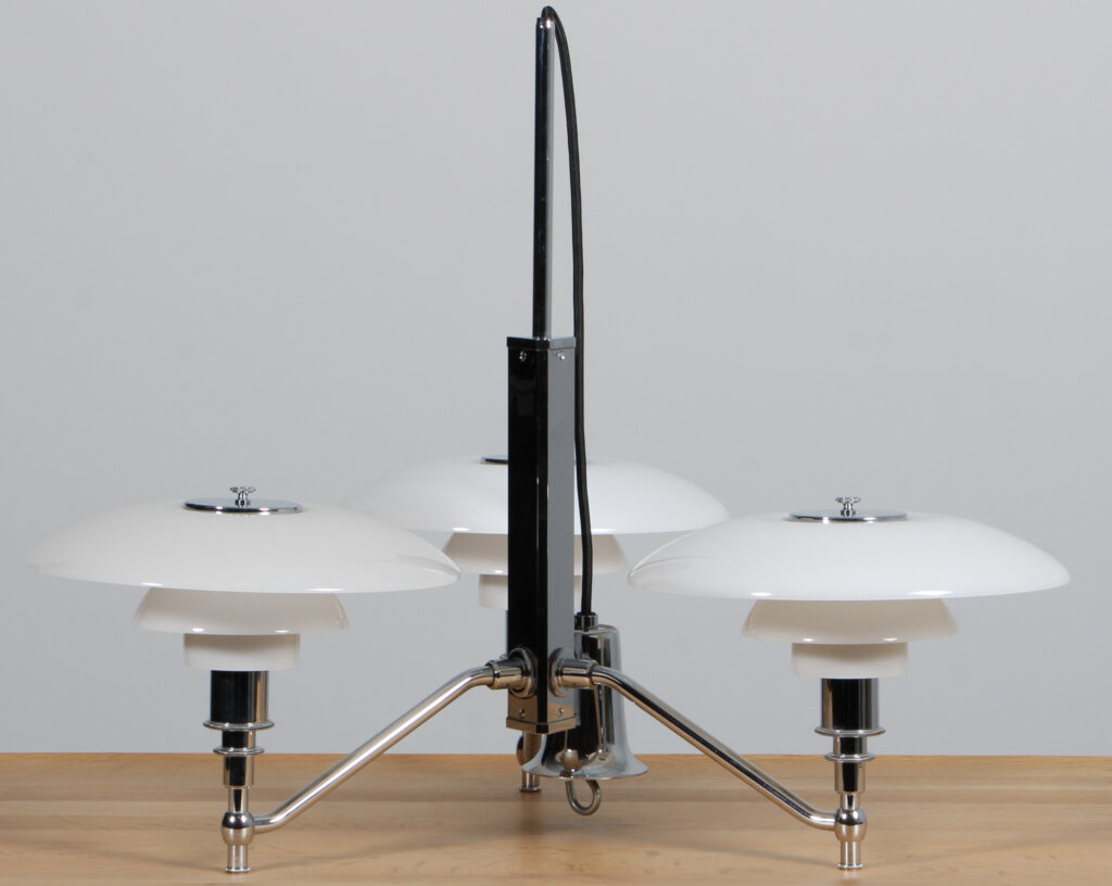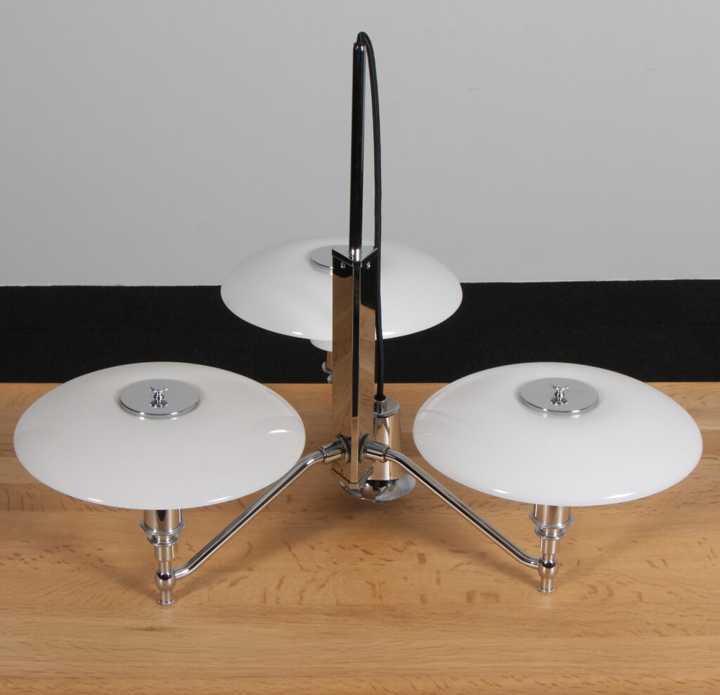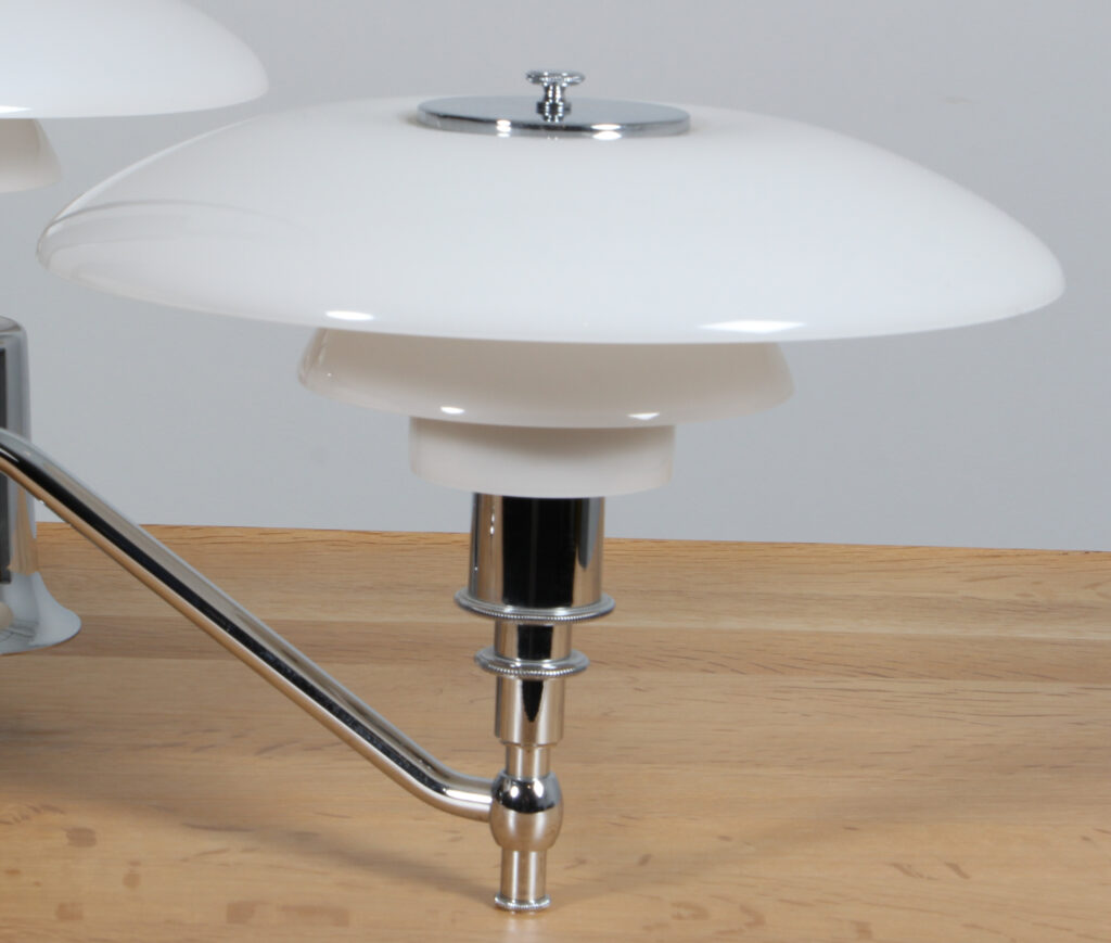 Poul Henningsen akademi krone med 3/2 skærmsæt af opal glas. Stel af forkromet stål. Fremstillet hos Louis Poulsen. H. 56 Ø. 70 cm.