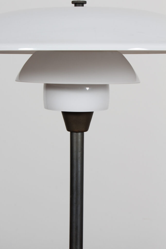 “PH-3,5/2”. Bordlampe med stamme af bruneret messing. Base af dukolakeret jern. Afbryderhus af bakelit med trykknapafbryder. Skærme af flerlags opalglas. Udført hos Louis Poulsen, 1940’erne. H. 42. Ø. 35 cm
