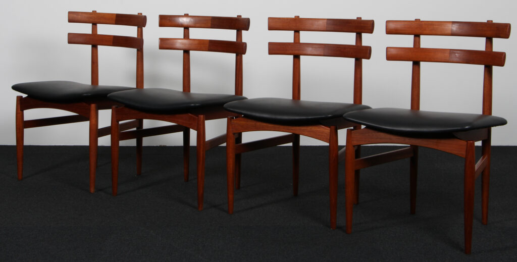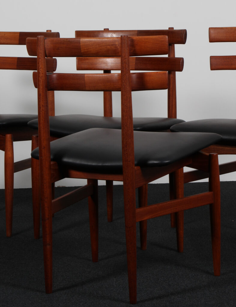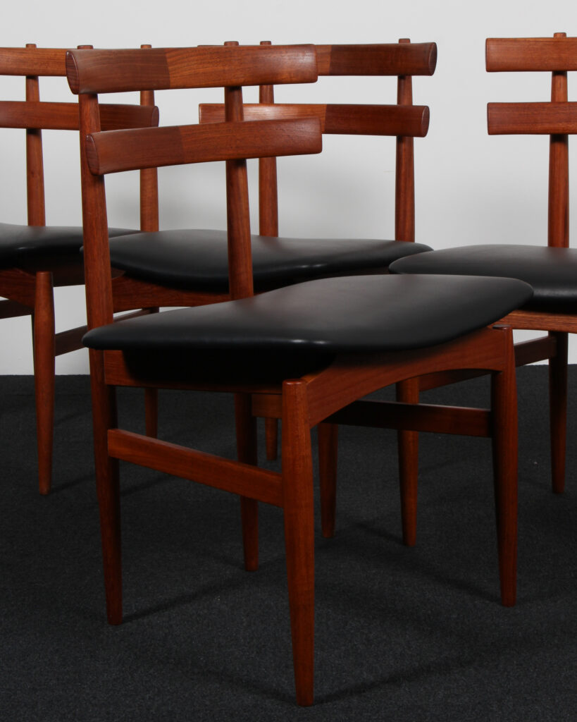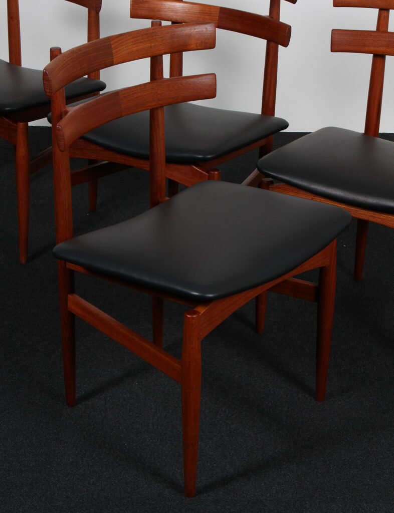 Poul Hundevad sæt på fire stole af teak. Nybetrukket med sort pure anilin læder. Fremstillet hos Poul Hundevad. H. 78/45 B. 50 D. 50 cm.