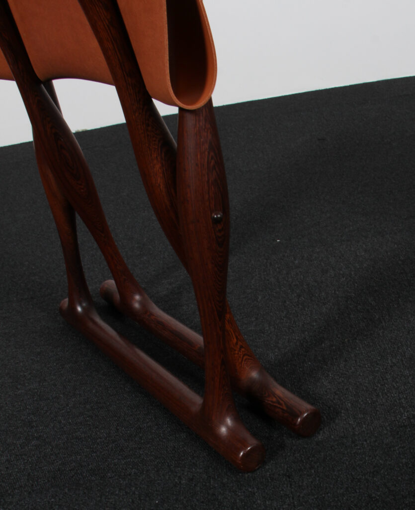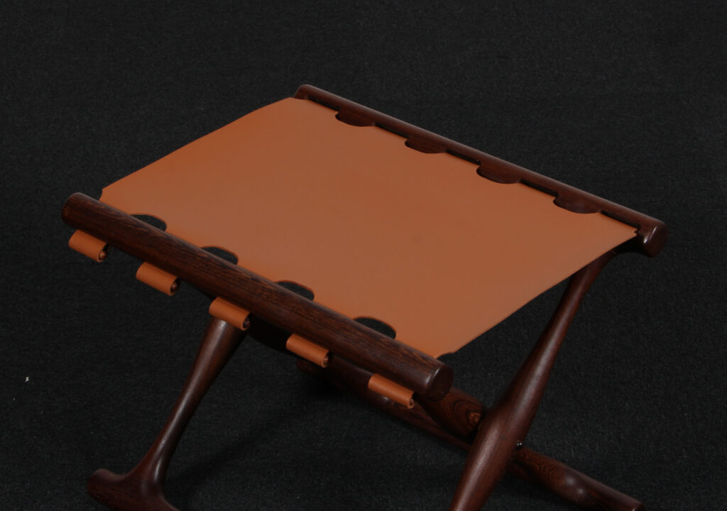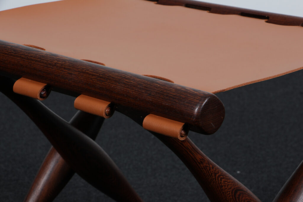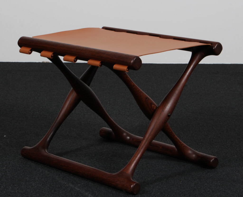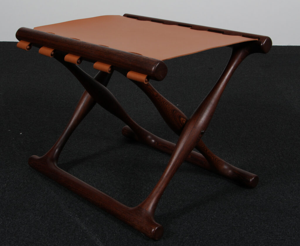 Poul Hundevad skammel med stel af Wenge. Nybeturkket med cognac farvet kernelæder. Model Guldhøj. H. 38 B. 46 D. 40 cm.