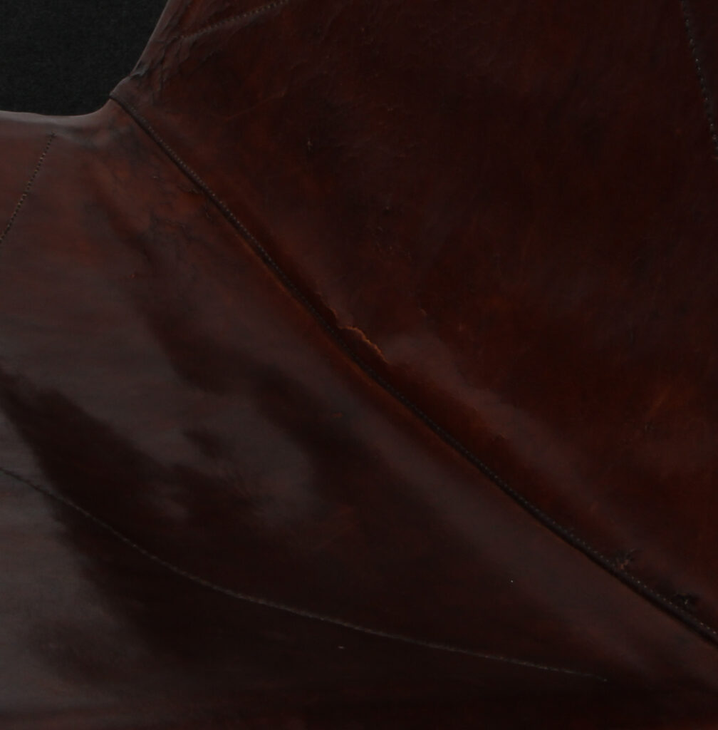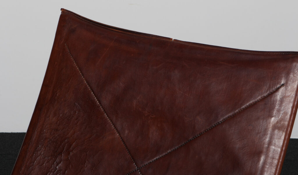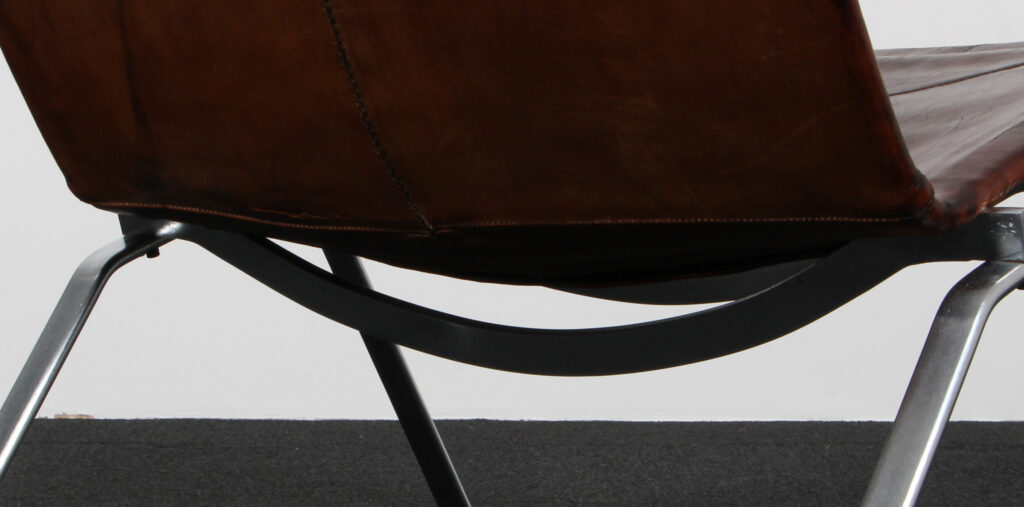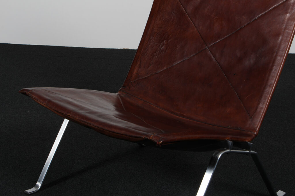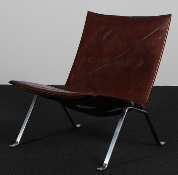 Poul Kjærholm lænestol med stel af fladstål. Original betrukket med kraftig patineret anilin læder. Model PK22, fremstillet hos E. Kold Christensen. H. 72/35 B. 63 D. 65 cm. Fremstår med kraftig patineret læder med defekter.