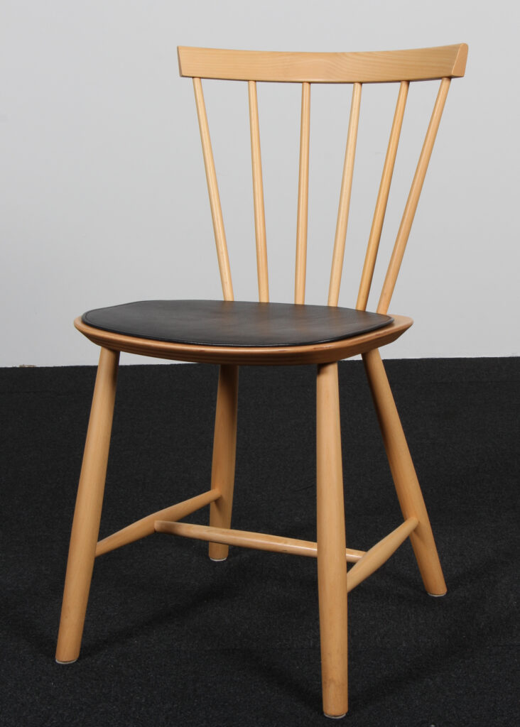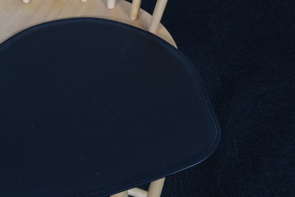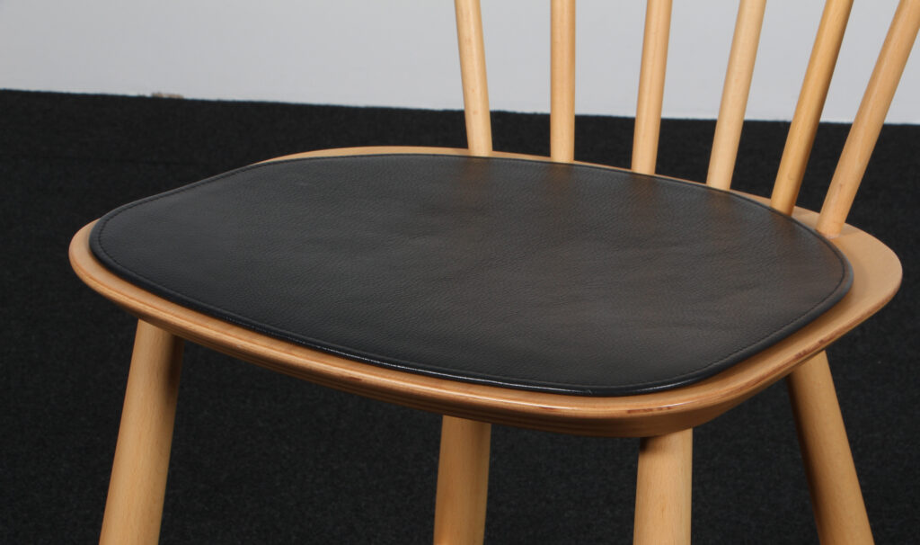Poul M. Volther stolehynde af sort læder, med anti skrid på bagside. Til model J46. Fremstillet af FDB.